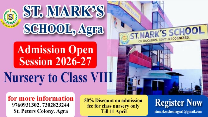 आगरालीक्स…आगरा के सेंट मार्क्स स्कूल में सत्र 2026-27 के लिए एडमिशन शुरू. नर्सरी से कक्षा 8वीं तक के लिए करें एप्लाई. कक्षा नर्सरी के प्रवेश शुल्क पर 50% की छूट…11 अप्रैल तक