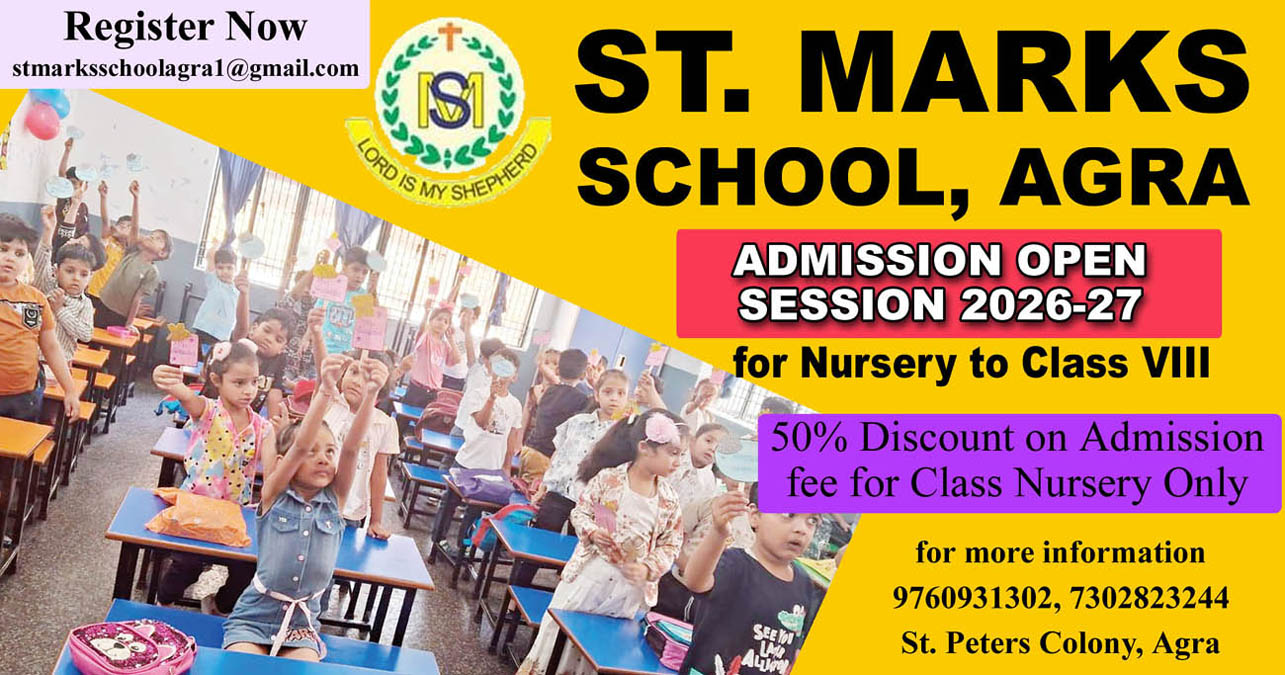 आगरालीक्स…आगरा के सेंट मार्क्स स्कूल में सत्र 2026-27 के लिए एडमिशन शुरू. नर्सरी से कक्षा 8वीं तक के लिए करें एप्लाई. कक्षा नर्सरी के प्रवेश शुल्क पर 50% की छूट…11 अप्रैल तक