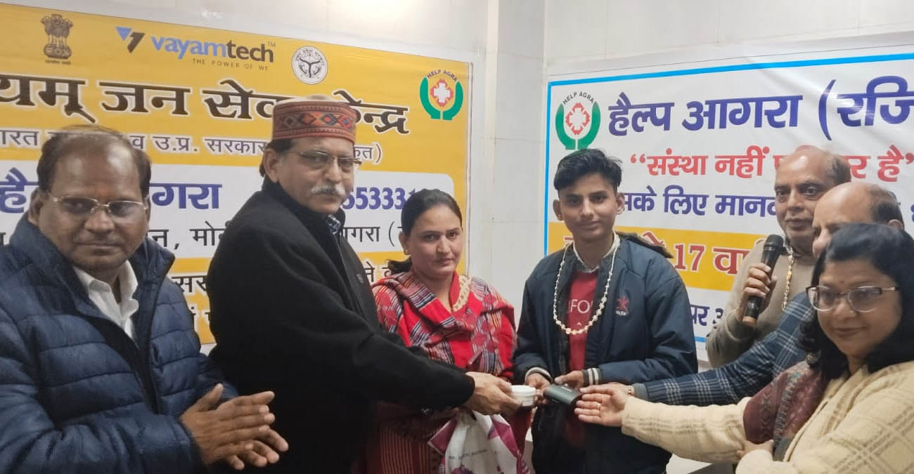 यह मामला हैल्प आगरा के संज्ञान में आया तो दानदाताओं से सहयोग की अपील की गई. दानदाताओं के सहयोग से संस्था ने उक्त मशीन आज उसको प्रदत्त करा दी। जिससे वह अब सुन सकेगा। हेल्प आगरा कार्यालय पर आज रविवार को उक्त मशीन के सहयोगियों की मौजदूगी में संस्था के अध्यक्ष सुरेंद्र जैन ने प्रदत्त की। मशीन पाकर उसकी मां कंचन मयानी के चेहरे पर भी संस्था के प्रति कृतज्ञता के माव स्पष्ट झलक रहे थे। करीब 14 साल पहले धीरज के सिर से पिता का का साया उठ गया था।