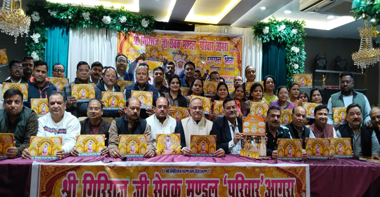 ब्रजभूमि की पावन द्वापर युग की परंपरा को जीवंत करते हुए श्री गिरिराज जी सेवक मण्डल परिवार, आगरा द्वारा श्री गुरु काष्र्णि आश्रम, बड़ी परिक्रमा मार्ग, आन्योर, गोवर्धन में आगामी 21 व 22 दिसंबर को आयोजित होने जा रहे श्री गिरिराज जी महाराज के दो दिवसीय भव्य छप्पन भोग मनोरथ की तैयारियां पूर्ण भक्ति भाव से चरम पर पहुँच चुकी हैं। प्रभु श्रीकृष्ण के श्रीगिरिराज स्वरूप को समर्पित इस दिव्य आयोजन की पावन भूमिका के रूप में कमला नगर स्थित मंगलम बैंक्विट में आमंत्रण पत्रिका का भक्तिमय वातावरण में विधिवत विमोचन किया गया।श्री गिरिराजज जी की छवि के सम्मुख चरण सेवक अजय गोयल, मनोज कुमार गर्ग, श्याम सुंदर माहेश्वरी, पवन अग्रवाल, मनीष गोयल, नीरज अग्रवाल,ने दीप प्रज्वलित कर कार्यक्रम का शुभारंभ किया। समस्त वातावरण “जय गिरिराज महाराज”, “गोवर्धन नाथ की जय” और “राधे-राधे” के मधुर उद्घोष से गूंज उठा। अजय गोयल एवं मनोज कुमार गर्ग ने भावविभोर होकर बताया कि इस वर्ष का छप्पन भोग महोत्सव श्रद्धा, सेवा और समर्पण का अनुपम संगम होगा। वैष्णव परंपरा के अनुरूप पूर्ण शुद्धता के साथ देसी घी में तैयार किए गए 11,000 किलो विविध व्यंजन प्रभु को अर्पित किए जाएंगे, जिन्हें 1100 छाबरियों में सुसज्जित कर भोग स्वरूप सजाया जाएगा।