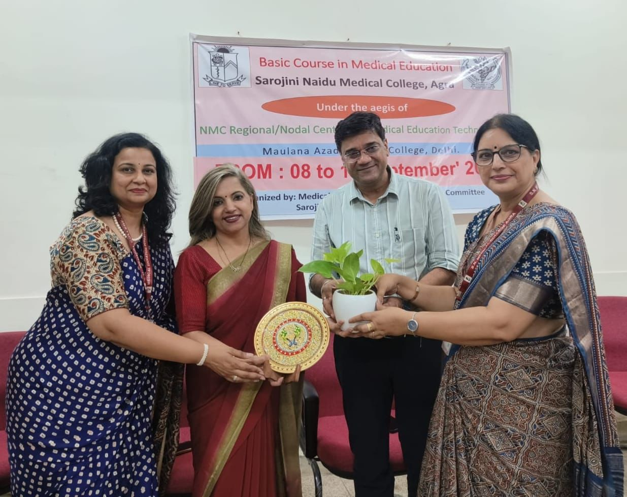 सरोजिनी नायडू मेडिकल कॉलेज आगरा में बेसिक कोर्स इन मेडिकल एजुकेशन की एक वर्कशॉप का आयोजन किया गया. यह तीन दिवसीय कार्यशाला 8 से 10 सितंबर 2025 तक चली, जिसमें 30 मेडिकल शिक्षकों को प्रशिक्षित किया गया। इस वर्कशॉप का आयोजन मेडिकल एजुकेशन कोऑर्डिनेटर डॉ. रेनू अग्रवाल ने एनएमसी नई दिल्ली और मौलाना आजाद मेडिकल कॉलेज नोडल केंद्र के सहयोग से किया. यह पूरा कार्यक्रम प्रधानाचार्य डॉ. प्रशांत गुप्ता के मार्गदर्शन में संपन्न हुआ।