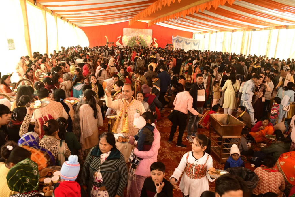 शुद्ध देशी घी से निर्मित 11000 किलो छप्पन भाेग 1100 चांदी की छबरियों में प्रभु चरणाें में अर्पित हुए। भजनों की धुन पर हर नर− नारी गोप− गोपी बन नृत्य करते रहे। रंभाते गोवंश और पशु पक्षियों की सजीव सी झांकियां आकर्षक लग रही थीं। भक्ति तभी पूर्ण होती है जब सेवा का मर्म भी उससे जुड़े। इसी ध्येय के साथ 551 साधुओं की सेवा प्रसादी एवं बर्तन वितरण के साथ हुयी। इसके बाद खीर, पुआ, मोहनथाल सहित एक दर्जन से अधिक व्यंजनों से सुस्वादिष्ट प्रसादी का स्वाद हजारों भक्तों ने लिया। देर रात तक महाप्रसादी हर भक्त के लिए उपलब्ध रही। सायंकाल आश्रम परिसर में ब्रज के भजनों की धूम रही। भजन संध्या एवं विविध झांकी दर्शन के बाद शयन आरती लाभ भक्तों ने लिया। 51 लीटर मेवायुक्त अमृततुल्य दुग्ध की प्रसादी का वितरण भक्तों में करने के साथ भव्य आयोजन का समापन हुआ।