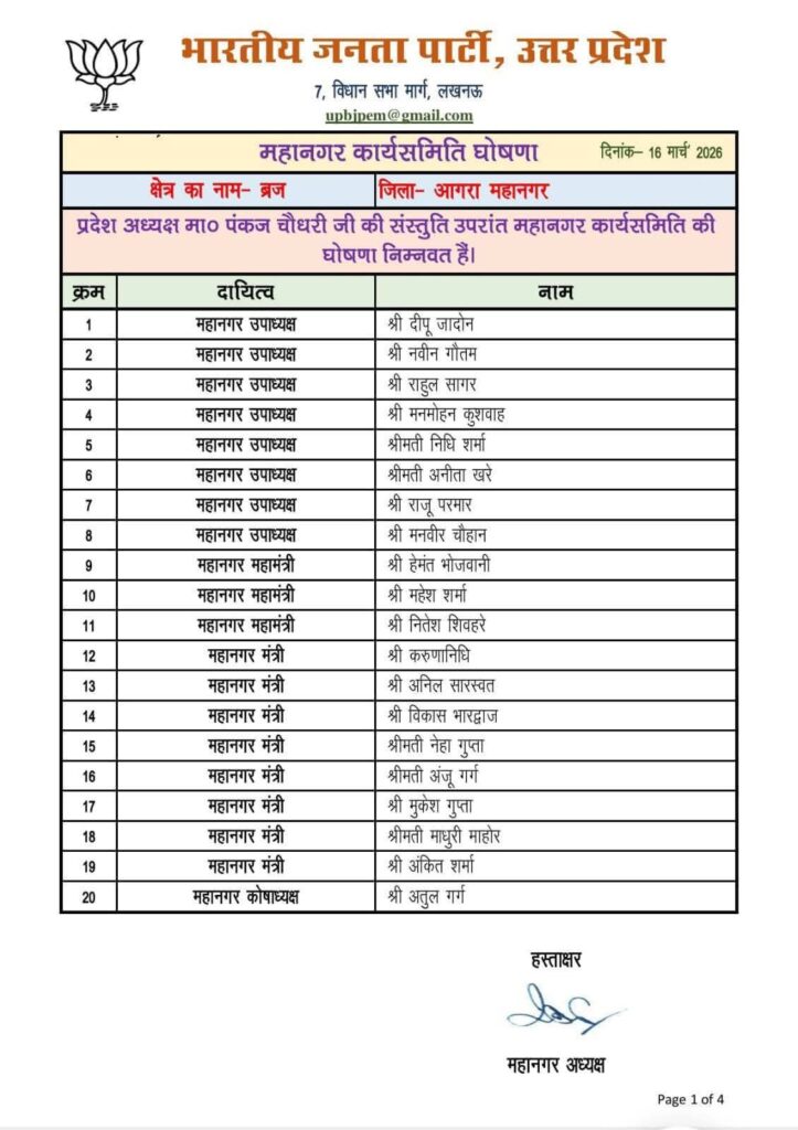 आगरालीक्स…Agra News: आगरा में विधानसभा चुनाव 2027 के लिए भाजपा महानगर कार्यकारिणी में 20 पदाधिकारी और 40 सदस्य घोषित, देखें।