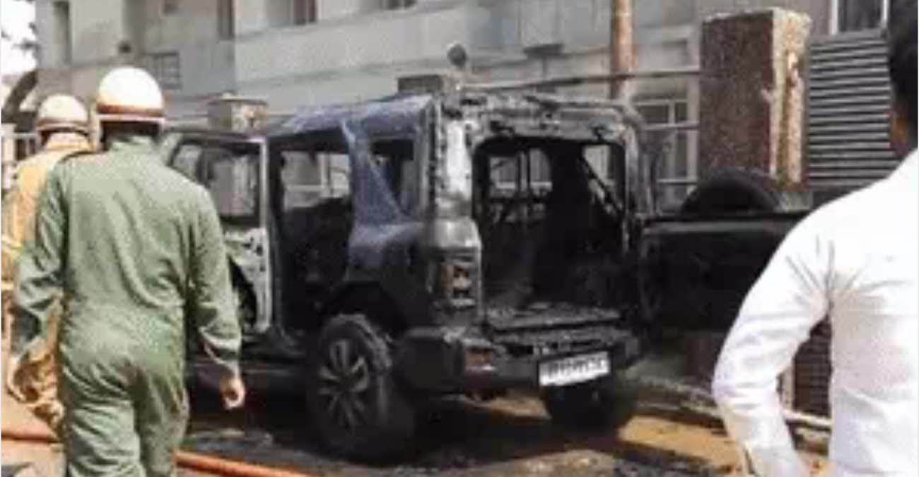 आगरालीक्स…आगरा में एक महीने पहले खरीदी थार कार में लगी आग. 5 मिनट में पूरी कार जल गई. अस्पताल परिसर में खड़ी थी.