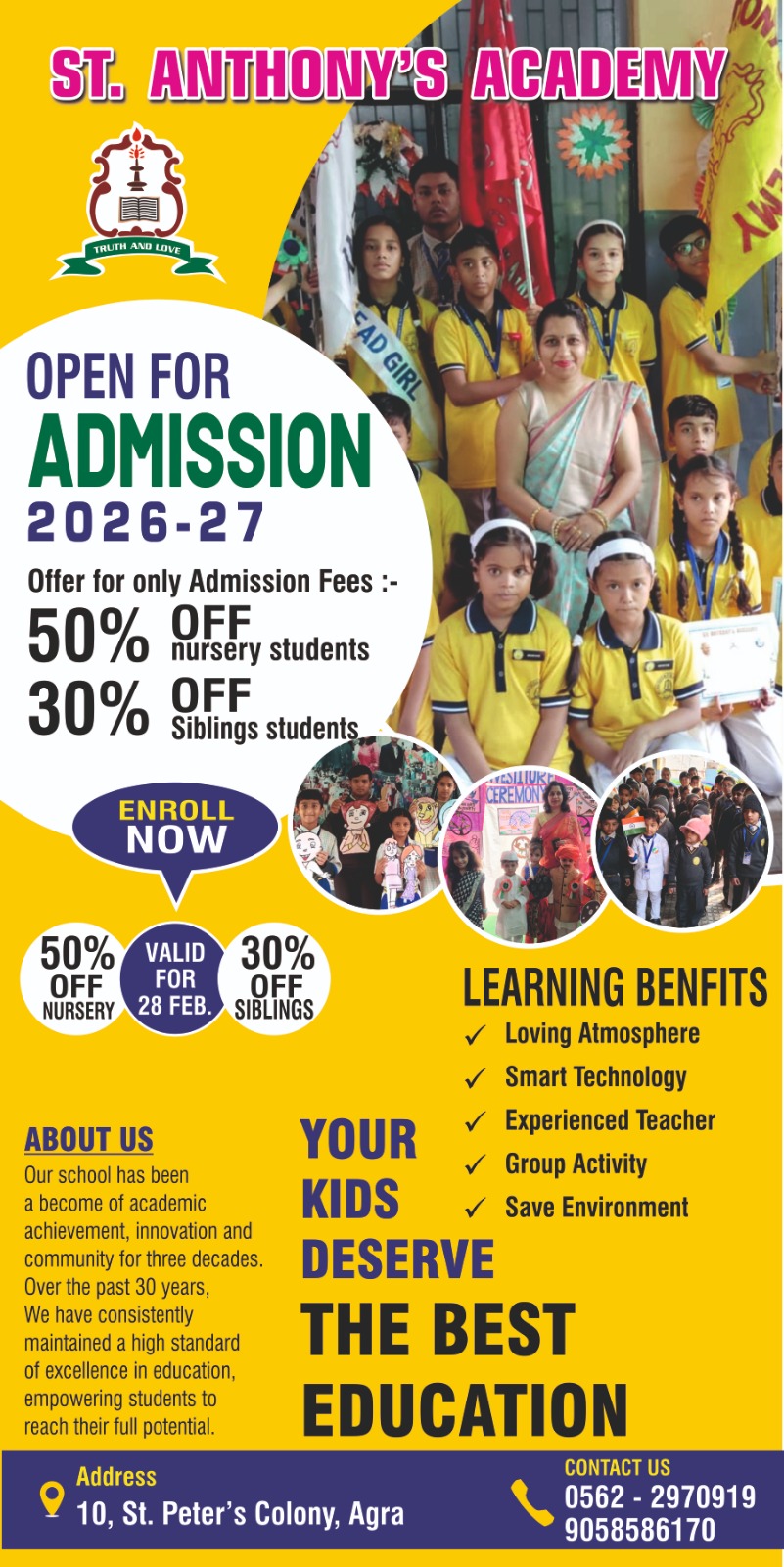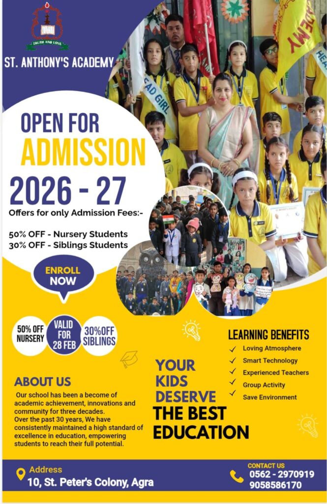 आगरालीक्स…Agra News: आगरा के ST. ANTHONY’S ACADEMY में सत्र 2026 – 27 के लिए एडमिशन शुरू हो गए हैं। एडमिशन फीस में डिस्काउंट भी, संपर्क करे :- 0562 – 2970919 , 9058586170 ,6397583079