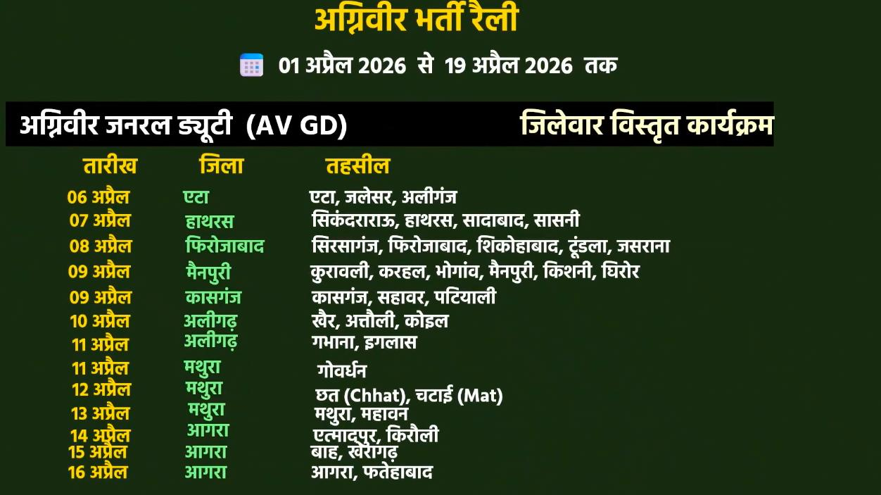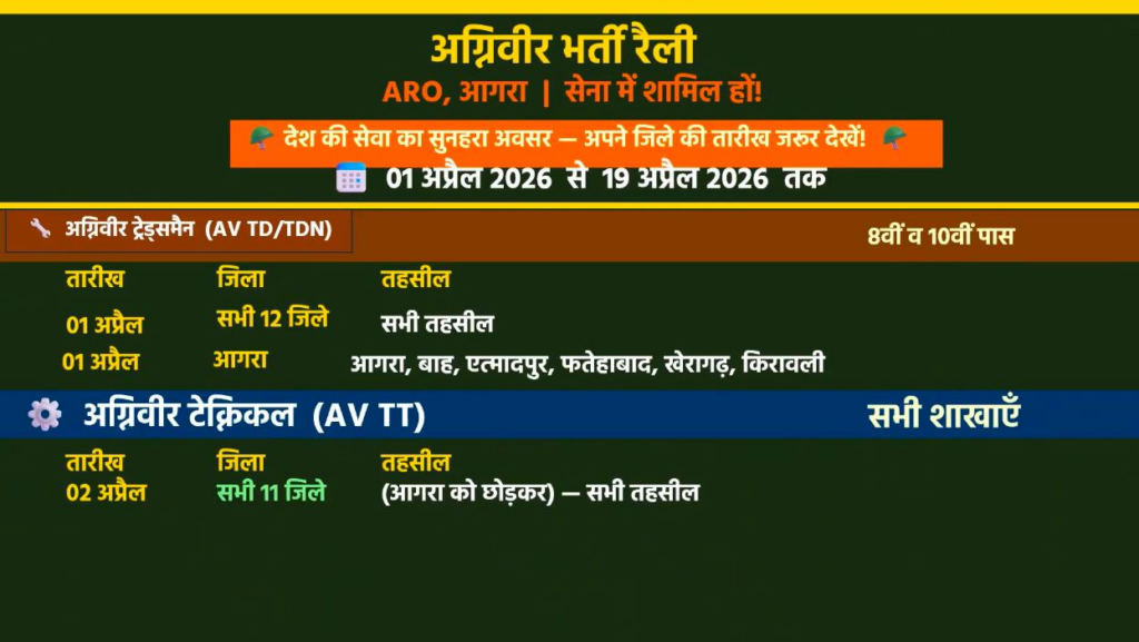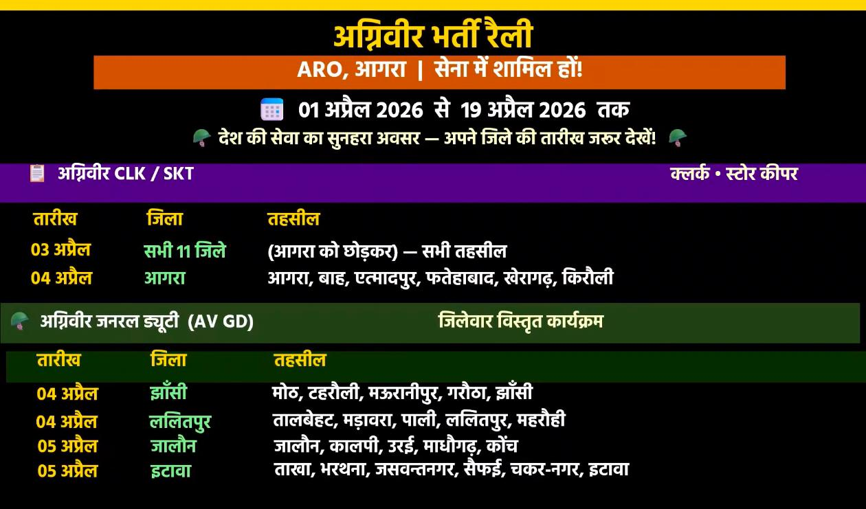 भारतीय सेना द्वारा अग्निवीर भर्ती रैली का आयोजन एकलव्य स्पोर्ट्स स्टेडियम, आगरा कैंट में 01 अप्रैल 2026 से किया जाएगा। यह रैली मुख्यालय भर्ती क्षेत्र (उत्तर प्रदेश एवं उत्तराखंड) के तत्वावधान में आयोजित की जा रही है। इस भर्ती रैली में उत्तर प्रदेश के 12 जिलों से लगभग 19,000 चयनित अभ्यर्थी भाग लेंगे। ये सभी अभ्यर्थी ऑनलाइन कॉमन एंट्रेंस एग्जाम उत्तीर्ण कर चुके हैं और अब शारीरिक, चिकित्सीय एवं दस्तावेज़ सत्यापन प्रक्रिया में सम्मिलित होंगे। रैली का आयोजन स्थानीय सैन्य प्राधिकरण एवं जिला नागरिक प्रशासन के निकट समन्वय से किया जा रहा है, जिससे भर्ती प्रक्रिया को पूर्णतः निष्पक्ष, पारदर्शी एवं सुव्यवस्थित बनाया जा सके।