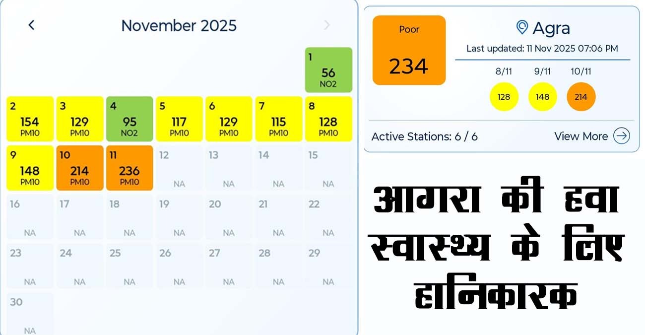 आगरा में एक नवंबर को वायु गुणवत्ता सूचकांक यानी एक्यूआई 56 था यह अच्छा माना जाता है। मगर, सर्दी बढ़ने से प्रदूषक तत्व निचली सतह पर बढ़ने से एक्यूआई बढ़ने लगा है। पिछले दो दिन से ठंडी हवा चलने से एक्यूआई 200 के पार पहुंच गया है। 10 नवंबर को एक्यूआई 214 था, 11 नवंबर यानी आज बुधवार को रात सात बजे एक्यूआई 234 रिकॉर्ड किया गया, यह बहुत खराब है और स्वास्थ्य के लिए ठीक नहीं है। विशेषज्ञों के अनुसार, सांस, ह्रदय और मधुमेह रोगियों को इस समय सबसे ज्यादा खतरा है।