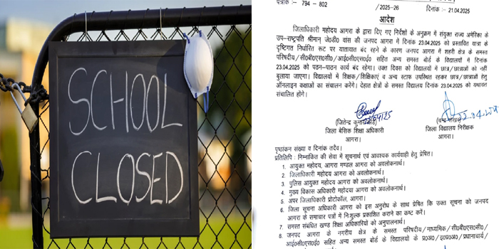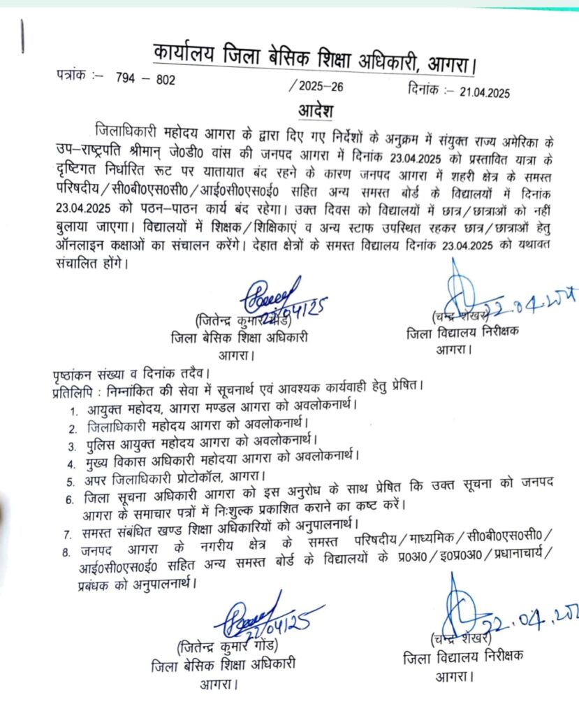 जिला विद्यालय निरीक्षक चंद्र शेखर और जिला विद्यालय निरीक्षक जितेंद्र कुमार गोंड ने डीएम के निर्देश पर शहरी क्षेत्र के सीबीएसई, आईसीएसई, यूपी बोर्ड सहित सभी बोर्ड के निजी और सरकारी स्कूलों में 23 अप्रैल को छात्रों के लिए बंद रखने के आदेश जारी दिए हैं। अमेरिकी उप राष्ट्रपति जेडी वेंस के चलते रूट डायवर्जन किया गया है इसलिए शहरी क्षेत्र के सभी बोर्ड के स्कूल बंद रहेंगे। स्कूल में शिक्षक आएंगे और आनलाइन कक्षाएं संचालित की जाएंगी।