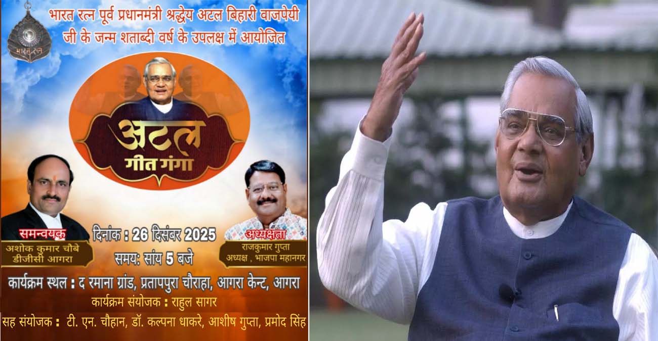 आगरालीक्स…काल के कपाल पे लिखता मिटाता हूं, गीत नया गाता हूं, हर बार की तरह इस बार भी नए गीतों के साथ भारत रत्न पूर्व प्रधानमंत्री अटल बिहारी बाजपेयी के जन्म शताब्दी वर्ष में 26 दिसंबर को होटल रमाना ग्रांड, प्रतापपुरा पर अटल गीत गंगा का आयोजन किया जा रहा है।