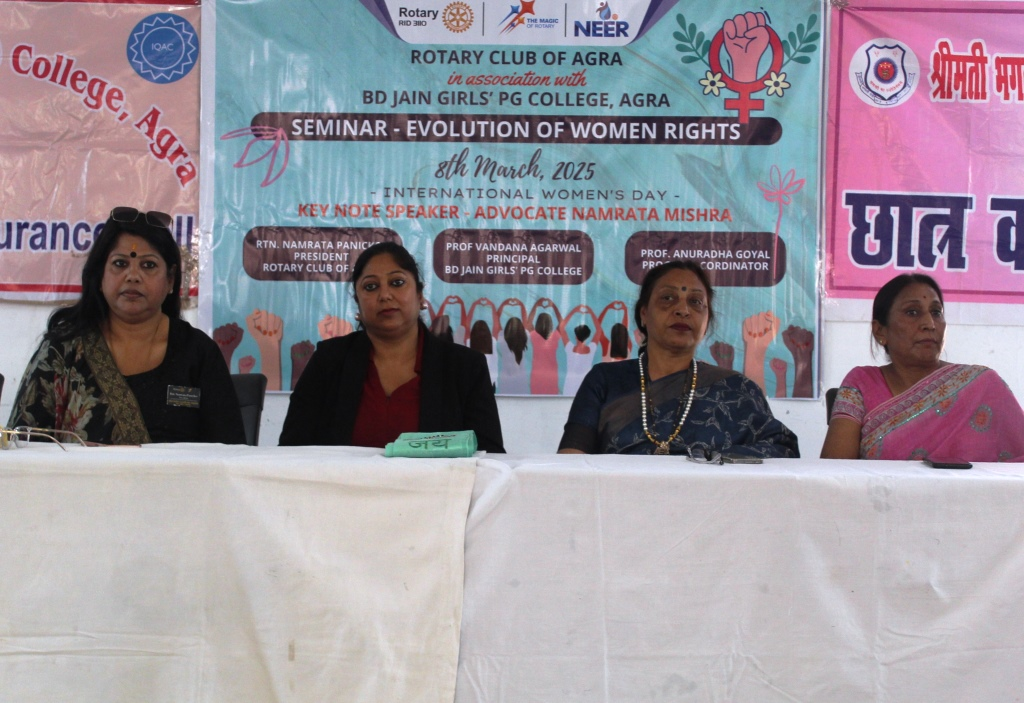 अंतर्राष्ट्रीय महिला दिवस के अवसर पर रोटरी क्लब ऑफ आगरा एवं बी.डी. जैन गर्ल्स पी.जी. कॉलेज के संयुक्त तत्वावधान में “महिलाओं के अधिकारों की उत्पत्ति” विषय पर एक संगोष्ठी का आयोजन किया गया। इस विचार-विमर्श में समाज में महिलाओं के अधिकारों की ऐतिहासिक यात्रा एवं उनके सशक्तिकरण से जुड़े विभिन्न पहलुओं पर चर्चा की गई।