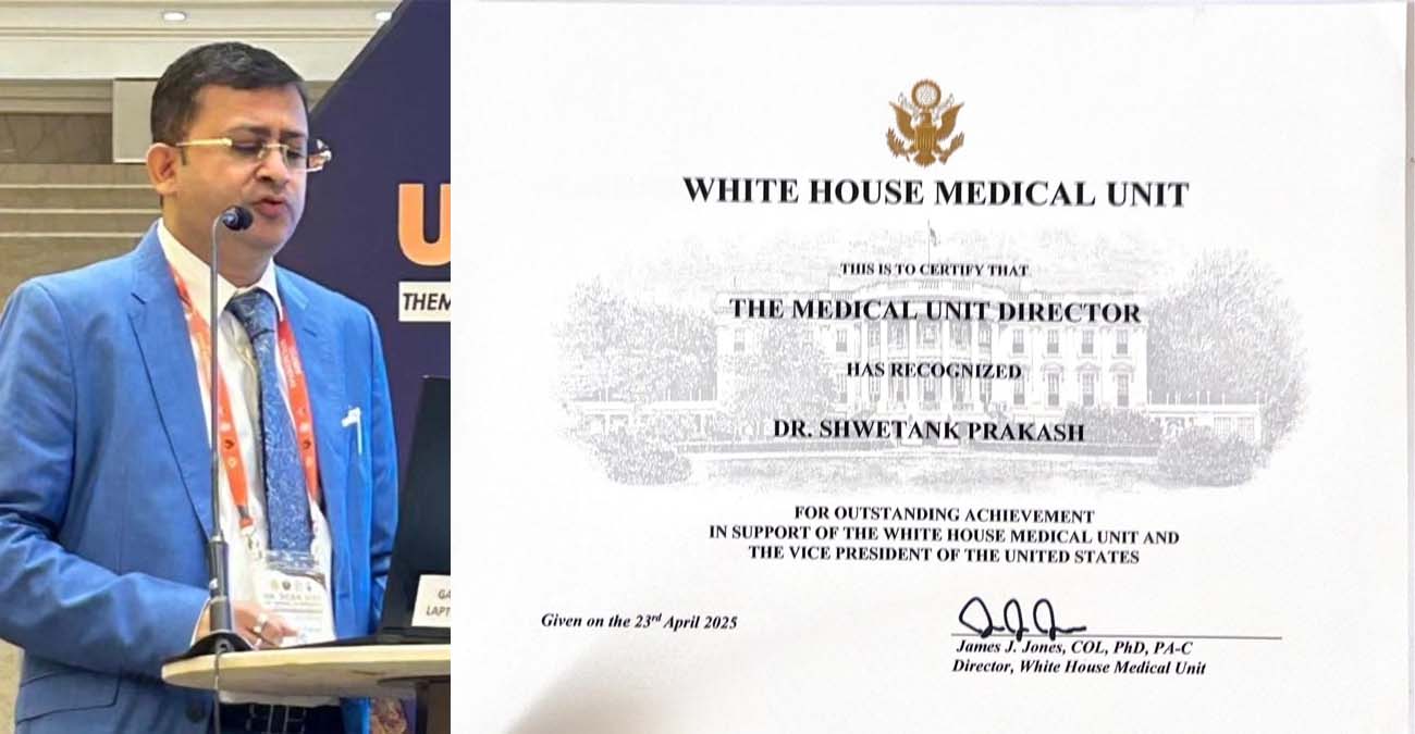 आगरा के शांतिवेद इंस्टीट्यूट आफ मेडिकल साइंसेस के डायरेक्टर और एडवांस्ड लेप्रोस्कोपी सर्जन डॉ. श्वेतांक प्रकाश ने एक उल्लेखनीय अंतरराष्ट्रीय उपलब्धि हासिल की है। हाल ही में उन्हें अमेरिका के व्हाइट हाउस मेडिकल यूनिट द्वारा औपचारिक सम्मान प्रदान किया गया है। यह सम्मान संयुक्त राज्य अमेरिका के उपराष्ट्रपति कार्यालय के मिशन में उत्कृष्ट सहयोग और चिकित्सा सेवा में श्रेष्ठ योगदान के लिए दिया गया है।व्हाइट हाउस मेडिकल यूनिट के निदेशक द्वारा हस्ताक्षरित यह प्रशस्ति-पत्र डॉ. श्वेतांक प्रकाश की वर्षों की मेहनत, समर्पण, वैश्विक स्तर पर चिकित्सा मानकों के प्रति प्रतिबद्धता और अद्वितीय विशेषज्ञता का प्रतीक है।
