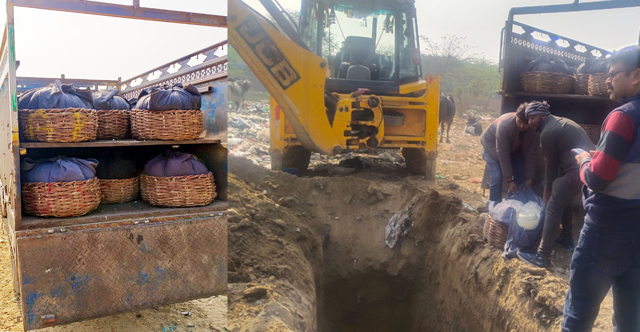 खाद्य सुरक्षा मानकों के अनुरूप न पाए जाने एवं अस्वच्छकर एवं अस्वस्थकर परिस्थितियों में भंडारित होने के कारण संपूर्ण खोये को व्यापक जनहित में बमरौली कटारा स्थित डंपिंग जोन में जेसीबी से गड्ढा खुदवाकर नियमानुसार नष्ट कर दिया गया. विभाग द्वारा संबंधित व्यक्तियों के विरुद्ध खाद्य सुरक्षा एवं मानक अधिनियम के अंतर्गत आवश्यक विधिक कार्यवाही की जा रही है. प्रयोगशाला से जांच रिपोर्ट प्राप्त होने पर अग्रिम कार्यवाही की जाएगी. खाद्य सुरक्षा एवं औषधि प्रशासन विभाग द्वारा लगातार कार्यवाही जारी रहेगी.