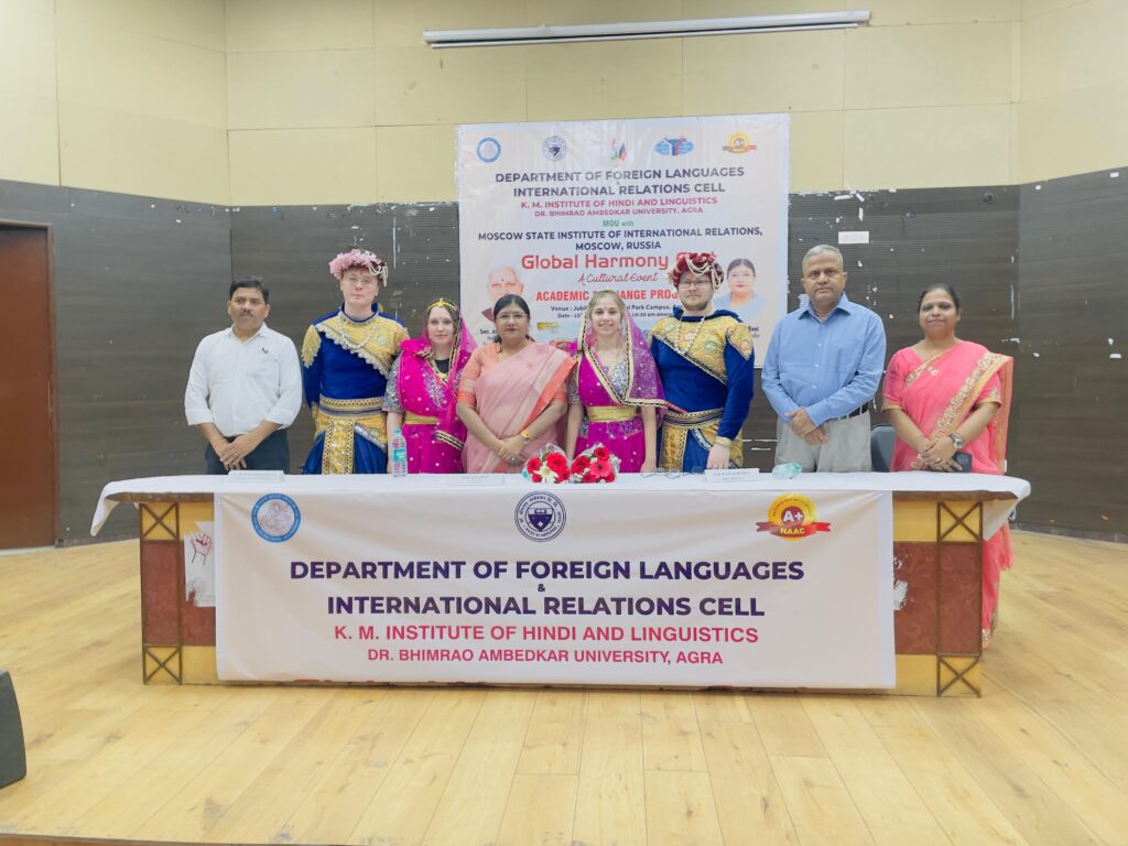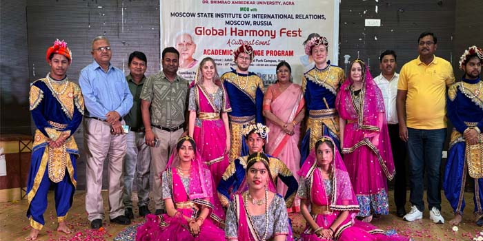 डॉ. भीमराव आंबेडकर विश्वविद्यालय के पालीवाल पार्क स्थित जुबली हॉल में गुरुवार को पूरी दुनिया के समाती दिखाई दी। इसमें जहां भारतीयता की झलक परीलक्षित हो रही थी, वहीं रूस, फ्रांस और जर्मन संस्कृति और सभ्यता की खुशबू भी घुली हुई थी। मौका था विश्वविद्यालय के अंतरराष्ट्रीय संबंध प्रकोष्ठ (इंटरनेशनल रिलेशन सेल) एवं रूस के मास्को स्टेट इंस्टीट्यूट ऑफ इंटरनेशनल रिलेशन्स विश्वविद्यालय मास्को के बीच हुए समझौता ज्ञापन के अंतर्गत अकादमिक एक्सचेंज कार्यक्रम में रूस से आए विद्यार्थियों के सम्मान में आयोजित ग्लोबल हार्मनी फेस्ट का, इसमें जहां रूसी विद्यार्थियों ने हिंदी और रूसी भाषा के गीतों व नृत्य की प्रस्तुत देकर सभी को आश्चर्यचकित कर दिया, वहीं कन्हैयालाल माणिकलाल मुंशी हिंदी तथा भाषाविज्ञान विद्यापीठ के विदेशी भाषा विभाग के विद्यार्थियों ने भी रशियन, फ्रैंच और जर्मन भाषा के लोक गीतों के साथ वहां के प्रसिद्ध गीत प्रस्तुत किए, साथ ही इन देशों की सांस्कृतिक नृत्य प्रस्तुतियों ने मंत्रमुग्ध कर दिया ।