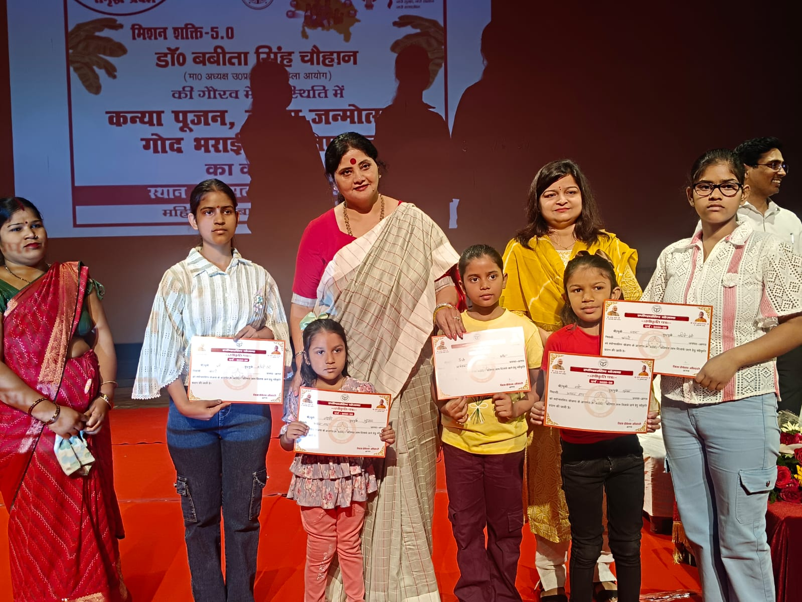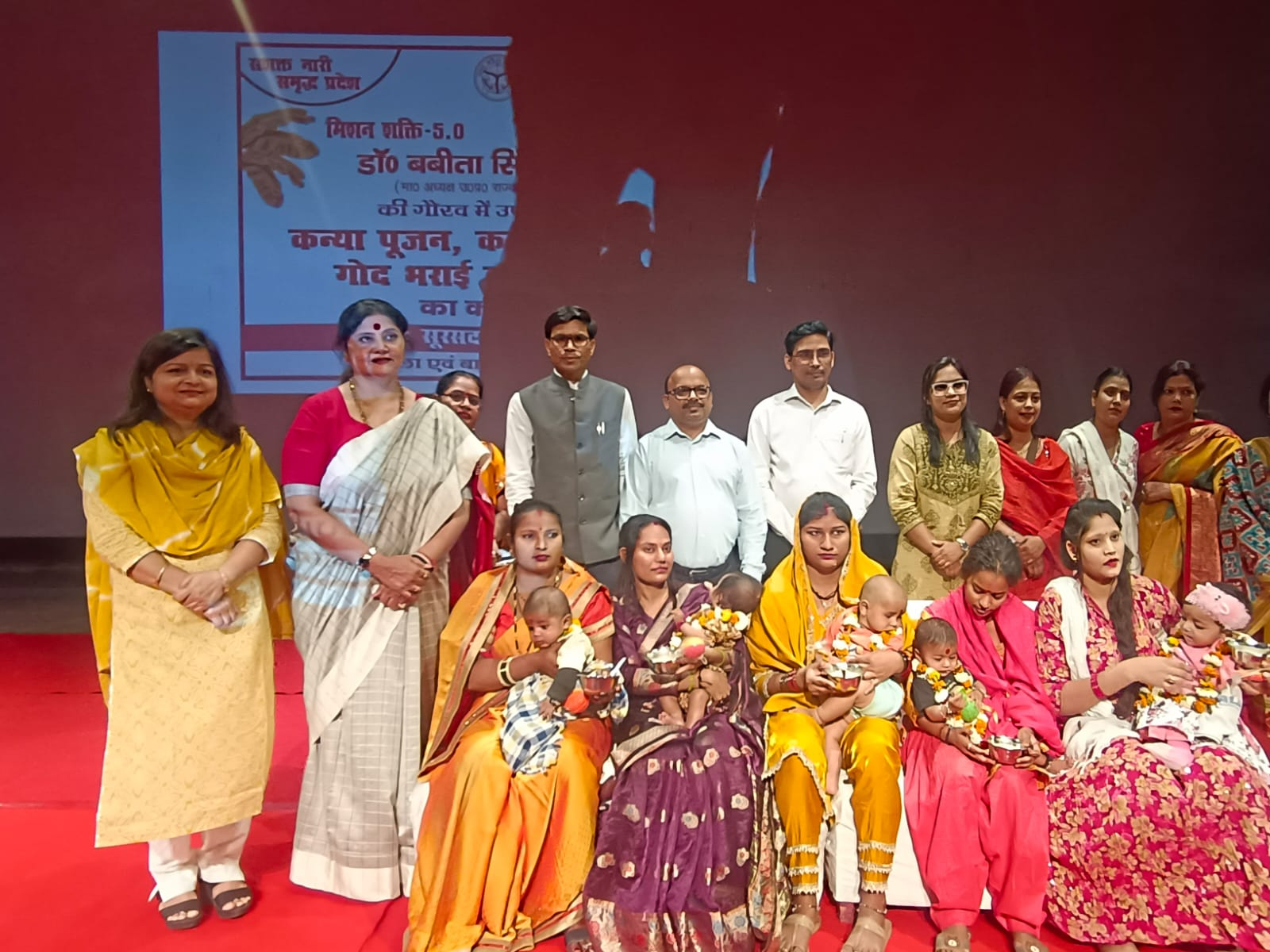महिला एवं बाल विकास विभाग के तत्वावधान में उत्तर प्रदेश सरकार के ‘नव निर्माण के 09 वर्ष’ पूर्ण होने के उपलक्ष्य में सूरसदन प्रेक्षागृह में राज्य महिला आयोग अध्यक्ष डा. बबीता सिंह चौहान की गरिमामई उपस्थिति में कन्या पूजन, कन्या जन्मोत्सव, गोद भराई व अन्नप्राशन कार्यक्रम का भव्य आयोजन किया गया। कार्यक्रम का शुभारम्भ दीप प्रज्ज्वलित कर व मां सरस्वती की प्रतिमा पर माल्यार्पण कर किया गया। कार्यक्रम के दौरान नवजात बच्चियों को बेबी किट वितरित की गई तथा रोली टीका लगाकर, लाल चुनरी एवं फल भेंट कर कन्या पूजन किया गया। इसके साथ ही गोदभराई एवं 6 माह तक के बच्चों का अन्नप्राशन कार्यक्रम भी आयोजित किया गया। महिला कल्याण विभाग की विभिन्न योजनाओं के लाभार्थी बच्चों को प्रशस्ति पत्र प्रदान कर सम्मानित किया गया।