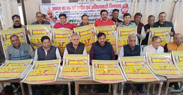 बताया कि आगरा दिगम्बर जैन परिषद, आगरा सकल दिगम्बर जैन समाज, श्रीअग्रवाल दिगम्बर जैन समिति, मोती कटरा द्वारा आयोजित कार्यक्रम में श्रीदिगम्बर जैन महासभा, मोती कटरा महिला मण्डल, शांतिनाथ युवा मण्डल, ज्ञानोदय क्लब सहयोगी संस्थाओं के रूप में मौजूद रहेंगी। 15 फरवरी को प्रातः 8 बजे ध्वजारोहण एवं बाहुबली विधान के साथ कार्यक्रम का शुभारम्भ बड़ा मंदिर मोती कटरा में होगा। वहीं दोपहर 12 बजे उपाध्याय पदारोहण एवं मुनिदीक्षा दिवस तार की गली, मोती कटरा में होगा। 16 फरवरी को प्रातः 8 बजे भगवान बाहुबली महामस्तिकाभिषेक का आयोजन बड़ा मंदिर मोती कटरा में होगा। जिसमें 1008 कलशों से भगवान बाहुबली का महामस्तिकाभिषेक सम्पन्न कराया जाएगा। इस अवसर पर मुख्य रूप से सत्यप्रकाश, सुनील आलोक जैन, विवेक जैन, पवन जैन, संजय जैन, महेश चंद जैन, मनोज जैन, विजय जैन, पंकज मूच आदि उपस्थित थे।