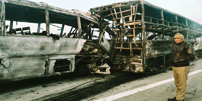 मीडिया रिपोर्ट के अनुसार, सात बस और तीन कार में आग लग गई। पुलिस ने बस में जिंदा जले चार लोगों के शव को बाहर निकाल लिया है। रेस्क्यू आपरेशन जारी है। इसके साथ ही बड़ी संख्या में आग में जले लोगों को अस्पताल में भर्ती कराया गया है। कई टीमें आग में झुलसे लोागें के इलाज में जुटी हैं।