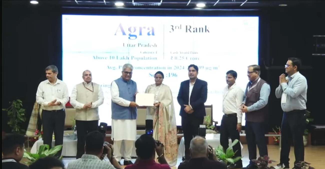 स्वच्छता सर्वेक्षण के बाद आगरा ने स्वच्छ वायु सर्वेक्षण 2025 में भी अपना लोहा मनवाया है। केंद्रीय पर्यावरण मंत्रालय की ओर से जारी सर्वेक्षण रिपोर्ट में आगरा ने देश में तीसरा स्थान हासिल किया है। मंगलवार को नई दिल्ली में केंद्रीय पर्यावरण मंत्री भूपेंद्र यादव द्वारा आगरा की महापौर हेमलता दिवाकर कुशवाहा और नगरायुक्त अंकित खंडेलवाल को अवार्ड देकर सम्मानित किया गया।महापौर हेमलता दिवाकर कुशवाहा ने अवार्ड प्राप्त करने के बाद खुशी जताते हुए इस उपलब्धि का श्रेय नगर निगम की टीम और आगरा की जागरूक जनता को दिया। उन्होंने कहा कि 2024 के बाद आगरा ने 2025 में भी अपने प्रदर्शन को दोहराया है। देश में आगरा को तीसरा और उत्तर प्रदेश में पहला स्थान मिला है। सूची में पहला और दूसरा स्थान मध्यप्रदेश के दो शहरों इंदाैर और जबलपुर को हासिल हुआ है। महापौर ने कहा कि उनका उद्देश्य आगरा को स्वच्छ हवा सहित अन्य मानकों में स्वच्छता की दृष्टि से देश का पहला शहर बनाना है।