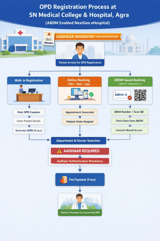 आगरा का एसएन मेडिकल कॉलेज भी डिजिटल हो गया है. एसएन मेडिकल कॉलेज और संबद्ध चिकित्सालय ने स्वास्थ्य सेवाओं के डिजिटलीकरण की दिशा में एक महत्वपूर्ण कदम उठाते हुए Ayushman Bharat Digital Mission के अंतर्गत NextGen eHospital प्रणाली को सफलतापूर्वक लागू कर दिया है. इस नई डिजिटल व्यवस्था के माध्यम से मरीजों को अधिक पारदर्शी, त्वरित एवं सुगम स्वास्थ्य सेवाएं उपलब्ध होंगी. अब लोगों को ओपीडी में रजिस्ट्रेशन में घंटों लाइन में लगने की जरूरत नहीं होगी. घर बैठे ही डिजिटल ओपीडी पंजीकरण किया जा सकता है. यही नहीं पंजीकरण के साथ जांच, उपचार और अन्य सेवाएं भी अब एकीकृत डिजिटल प्लेटफार्म पर संचालित होंगी जिससे मरीजों को लंबी कतारों से राहत मिलेगी और सममय की बचत होगी. इन सुविधाओं का लाभ उठाने के लिए मरीजों को अपना आधार कार्ड लाना अनिवार्य है.डिजिटल प्लेटफार्म पर संचालित होंगी सेवाएं