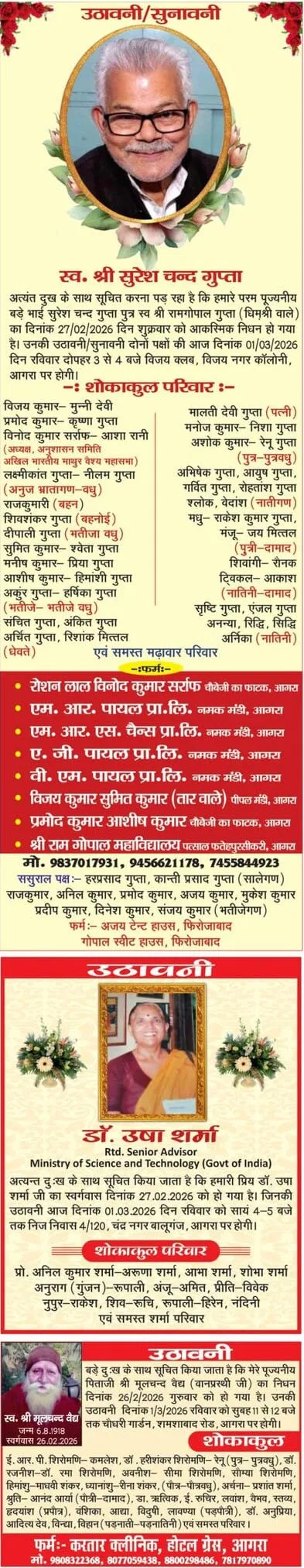 Agra News: Obituaries of Agra on 1st March February 2026