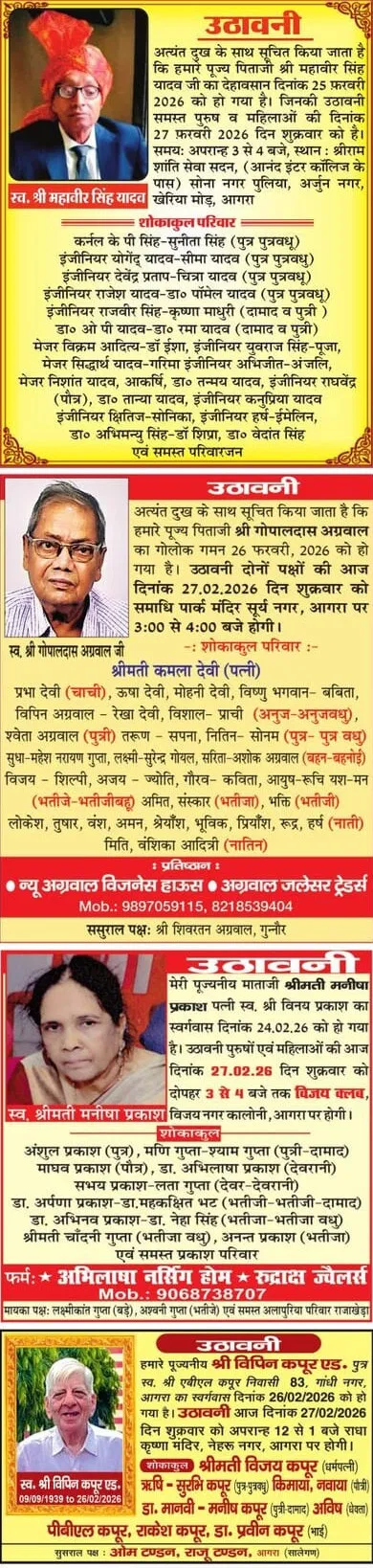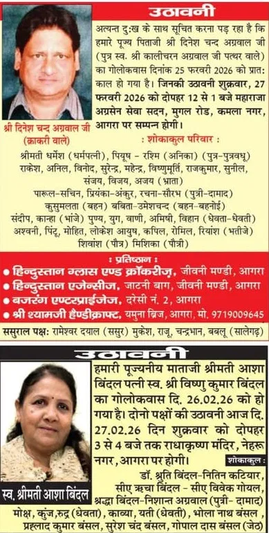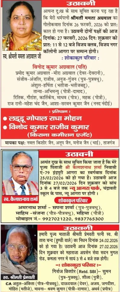 Agra News: Obituaries of Agra on 27th February 2026