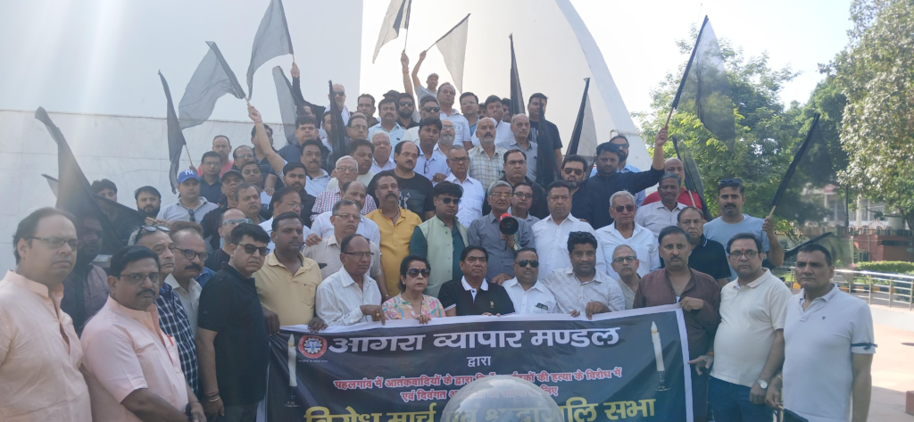 पहलगाम में हुए कायराना आतंकी हमले के विरोध में गुरुवार को आगरा व्यापार मंडल ने एकजुट होकर विरोध प्रदर्शन किया और शहीदों को श्रद्धांजलि दी। व्यापार मंडल के अध्यक्ष टीएन अग्रवाल के नेतृत्व में यह मार्च स्पीड कलर लैब से शुरू होकर शहीद स्मारक, संजय प्लेस तक निकाला गया। तीन दर्जन से अधिक व्यापारिक संगठनों के पदाधिकारी एवं सदस्यों ने काली पट्टियाँ बांधकर आतंकवाद के प्रति आक्रोश जताया। प्रदर्शन के बाद शहीदों की आत्मा की शांति एवं सम्मान में श्रद्धांजलि सभा का आयोजन किया गया। सभा के दौरान दो मिनट का मौन रखकर मृतकों को श्रद्धांजलि अर्पित की गई।इस अवसर पर आगरा क्लॉथ मर्केंटाइल एसोसिएशन, सराफा एसोसिएशन, आगरा फार्मा संगठन, लुहार गली बाजार समिति, रावत पाड़ा बाजार समिति, ताजगंज व्यापार समिति, प्लास्टिक संगठन, जौहरी बाजार समिति, मोतीगंज व्यापार समिति, हॉस्पिटल रोड व्यापार समिति, आगरा होलसेल हौजरी संगठन, पत्थर संगठन सेवला, बालूगंज ऑटो संगठन, सदर बाजार व्यापारी एसोसिएशन, भगत सिंह पेठा कुटीर उद्योग एसोसिएशन, आगरा इलेक्ट्रिक कांट्रेक्टर एसोसिएशन, दरेसी नंबर एक व्यापार समिति, श्री मोतीगंज व्यापार समिति, सीताराम मशीनरी मार्केट, वशिष्ठ मार्केट एसोसिएशन, आगरा इमिटेशन ज्वैलरी एसोसिएशन, ताजगंज रोड व्यापार समिति, लोहा मंडी व्यापार समिति, पत्थर व्यवसाय समिति, कमला नगर व्यापार समिति, मिठाई विक्रेता संगठन, कपड़ा संगठन, किराना संगठन, संजय प्लेस एसोसिएशन, शो फेडरेशन ऑफ़ आगरा, कैट आगरा, जय झूलेलाल सेवा संगठन, आयुर्वेदिक संगठन, रेडीमेड गारमेंट संगठन, लक्ष्मी मार्केट बेलनगंज, पुरुषार्थी संघ, कसेरट बाजार संघ आदि के पदाधिकारी एवं सदस्य मौजूद रहे, जिन्होंने हमले की कड़ी निंदा करते हुए सरकार से ठोस और प्रभावी कार्यवाही की मांग की।