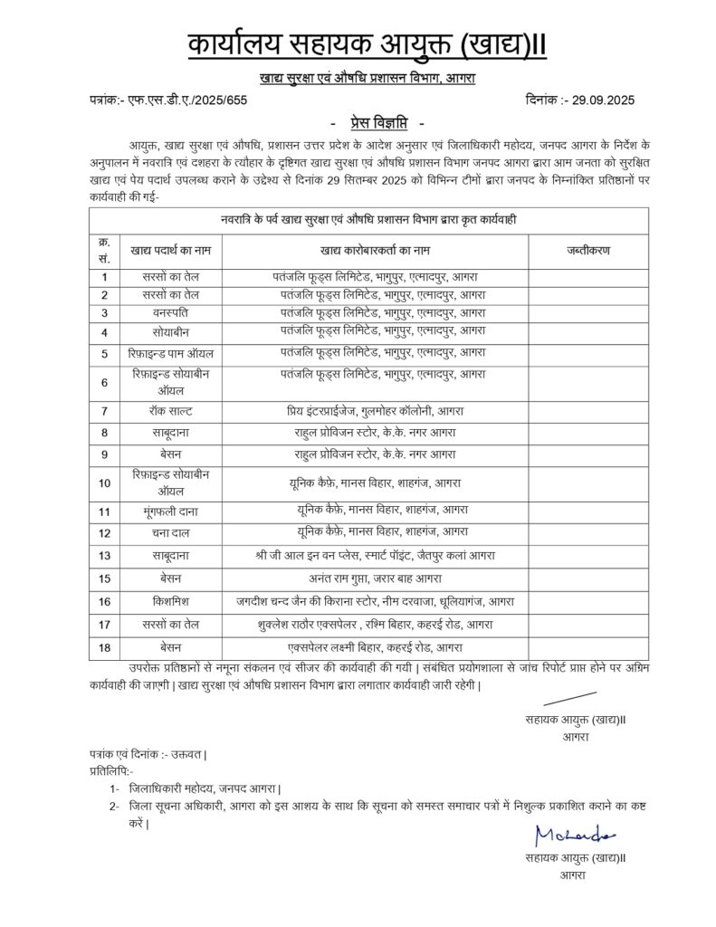 आगरालीक्स…आगरा में सरसों का तेल, रिफाइंड, बेसन, चना दाल, साबूदाना के लिए गए सैंपल. कई दुकानों और स्टोरों पर पहुंचाी खाद्य विभाग की टीम.