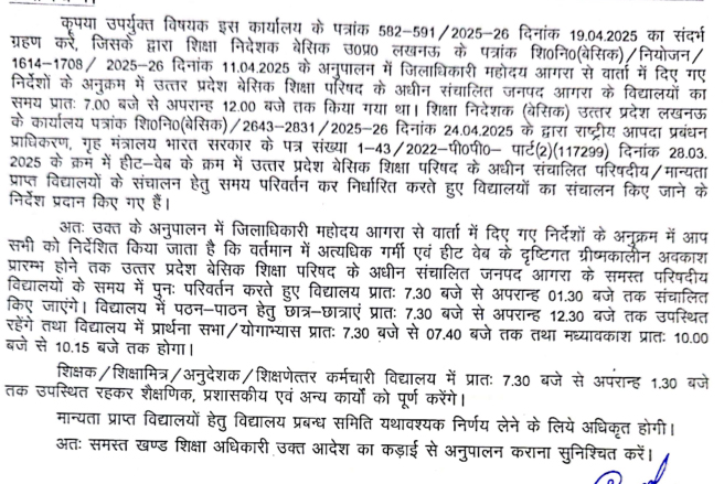 बेसिक शिक्षा की ओर से जारी किए आदेश में बताया गया कि उत्तर प्रदेश बेसिक शिक्षा परिषद के अधीन संचालित जनपद आगरा के विद्यालयों का समय प्रातः 7.00 बजे से अपरान्ह 12.00 बजे तक किया गया था। जिलाधिकारी से वार्ता में दिए गए निर्देशों के अनुक्रम में आप सभी को निर्देशित किया जाता है कि वर्तमान में अत्यधिक गर्मी एवं हीट वेब के दृष्टिगत ग्रीष्मकालीन अवकाश प्रारम्भ होने तक उत्तर प्रदेश बेसिक शिक्षा परिषद के अधीन संचालित जनपद आगरा के समस्त परिषदीय विद्यालयों के समय में पुनः परिवर्तन करते हुए विद्यालय प्रातः 7.30 बजे से अपरान्ह 01.30 बजे तक संचालित किए जाएंगे। विद्यालय में पठन-पाठन हेतु छात्र-छात्राएं प्रातः 7.30 बजे से अपरान्ह 12.30 बजे तक उपस्थित रहेंगे तथा विद्यालय में प्रार्थना सभा / योगाभ्यास प्रातः 7.30 बजे से 07.40 बजे तक तथा मध्यावकाश प्रातः 10.00 बजे से 10.15 बजे तक होगा। शिक्षक/शिक्षामित्र/अनुदेशक / शिक्षणेत्तर कर्मचारी विद्यालय में प्रातः 7.30 बजे से अपरान्ह 1.30 बजे तक उपस्थित रहकर शैक्षणिक, प्रशासकीय एवं अन्य कार्यों को पूर्ण करेंगे।