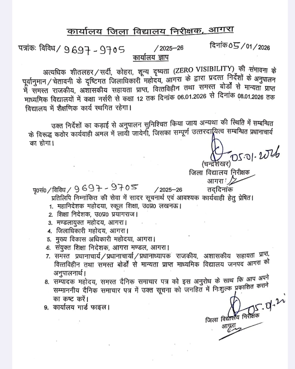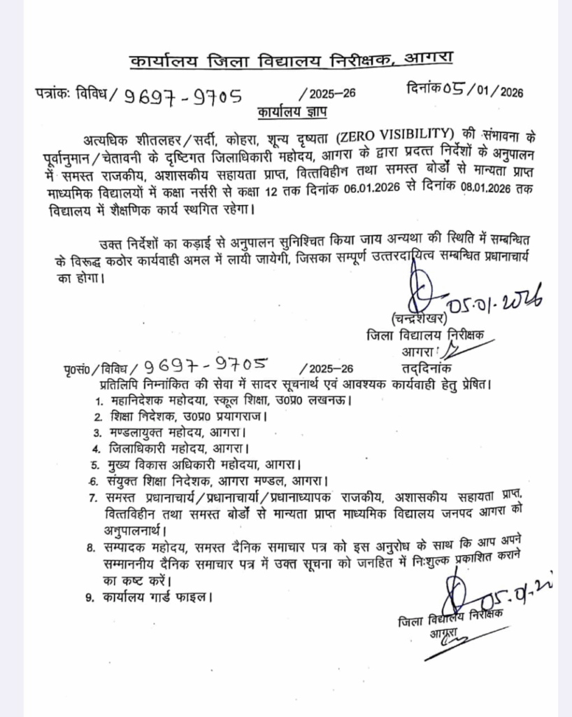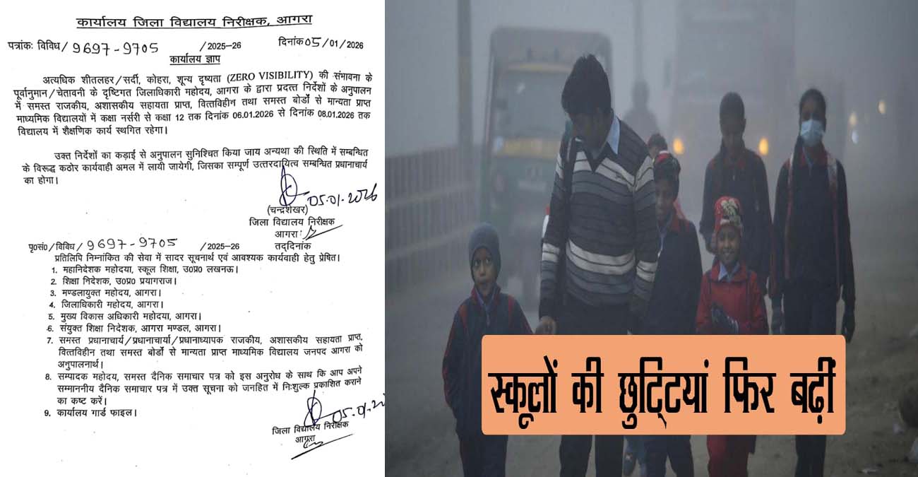 आगरालीक्स…आगरा में फिर बढ़ीं स्कूलों की छुट्टियां, देखें आदेश की कॉपी. जानें किस दिन तक बंद रहेंगे अब स्कूल