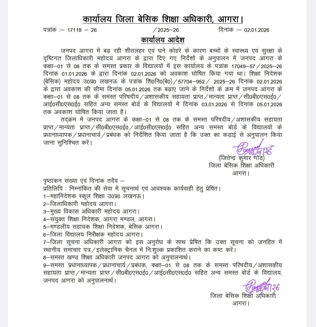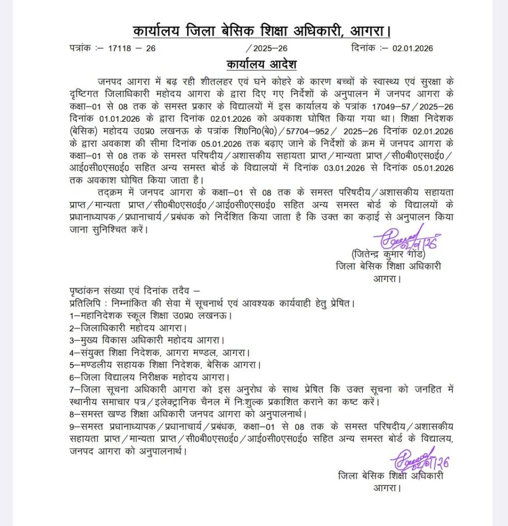 आगरालीक्स …Agra News: आगरा में शीतलहर के चलते कक्षा आठ तक के सभी बोर्ड के स्कूल पांच जनवरी तक बंद, जानें आज कैसा रहेगा मौसम। ( Agra News : School’s up to 8th closed in Agra due to cold waves#Agra)