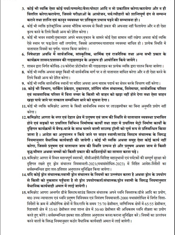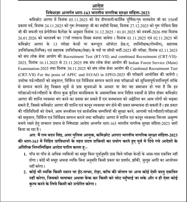 आगरा पुलिस कमिश्नरेट की ओर से आगामी पर्व/त्यौहारों, नव वर्ष, गणतंत्र दिवस तथा विभिन्न परीक्षाओं आदि को सकुशल संपन्न कराने तथा कानून/शांति व्यवस्था बनाए रखने के उद्देश्य से 30.10.2025 से दिनांक 31.01.2026 तक भारतीय नागरिक सुरक्षा संहिता (BNSS) की धारा-163 के अंतर्गत निम्नलिखित आदेश जारी किए गए हैं।