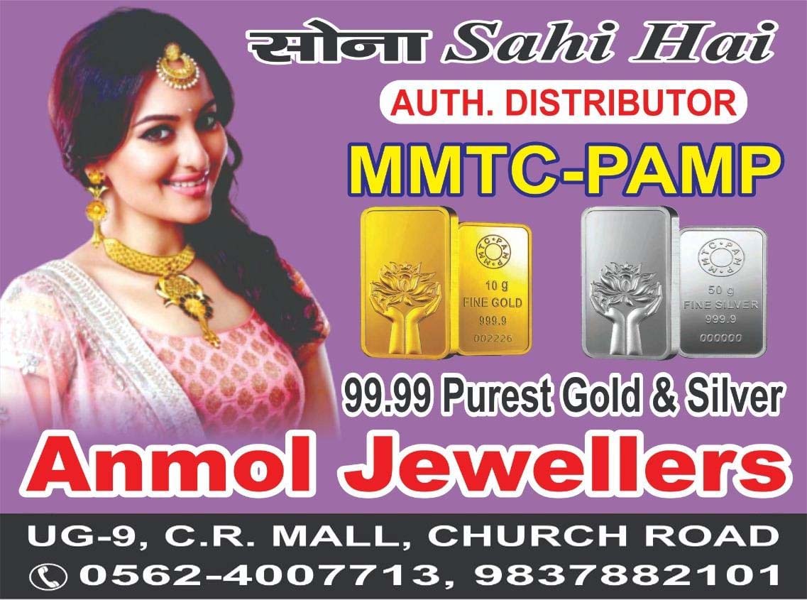 आगरालीक्स…धनतेरस पर सोना सही खरीदें, आगरा के अनमोल ज्वैलर्स पर करें शॉपिंग. 99.99 प्रतिशत प्योर सोना—चांदी के आभूषण…धनतेरस की शुभकामनाओं के साथ