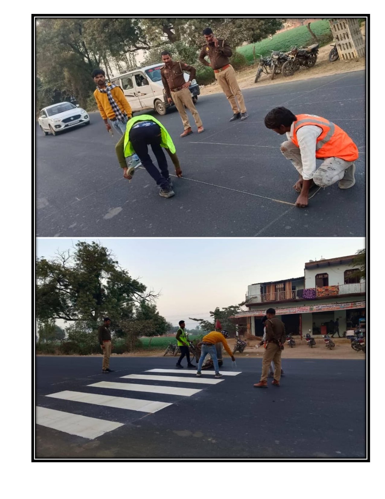 क्रिटिकल कॉरिडोर टीमों ने दुर्घटना-संवेदनशील तथा क्रिटिकल क्रैश लोकेशन पर पैदल यात्री सुरक्षा को प्राथमिकता देते हुए प्रभावी जेब्रा क्रॉसिंग का निर्माण किया, जिसका उद्देश्य सड़क पार करते समय पैदल यात्रियों को सुरक्षित मार्ग प्रदान करना है, जिससे उनके लिए तेज़ गति से चलने वाले वाहनों के बीच सड़क पार करना अधिक सुरक्षित और सुव्यवस्थित हो सके। जेब्रा क्रॉसिंग के निर्माण से वाहन चालकों और पैदल यात्रियों के बीच स्पष्ट विभाजन स्थापित होता है, जिससे चालक को पैदल चलने वालों को रुकने या धीमी गति से आगे बढ़ने का संकेत मिलता है और पैदल यात्री निर्धारित स्थान पर सुरक्षित रूप से सड़क पार कर पाते हैं, जिससे सड़क दुर्घटनाओं और जोखिमों में उल्लेखनीय कमी आती है। इस प्रकार की चिह्नित क्रॉसिंग न केवल सड़क पर अनुशासन और नियम पालन को बढ़ाती है, बल्कि वाहन चालकों को पैदल यात्रियों के अधिकारों के प्रति जागरूक भी करती है तथा सड़क उपयोग के दौरान होने वाली अनिश्चितताओं और भ्रम को कम करती है, जिससे सड़कों पर समग्र सुरक्षा वातावरण मजबूत होता है।