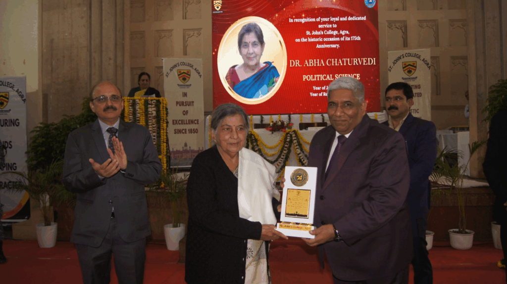 स्थापना दिवस समारोह के मुख्य अतिथि सुधीर अग्रवाल ने अपने संबोधन में सेंट जॉन्स कॉलेज को उत्तर भारत की अग्रणी शिक्षण संस्थाओं में से एक बताते हुए कहा कि 175 वर्षों की यह यात्रा उत्कृष्टता, अनुशासन और सेवा की परंपरा की साक्षी है। उन्होंने विद्यार्थियों से नवाचार, शोध और सामाजिक उत्तरदायित्व को अपने जीवन का उद्देश्य बनाने का आह्वान किया। कॉलेज के दिनों को याद करते हुए उन्होंने कहा कि ‘ यहां मुख्य अतिथि बनकर आना मेरे जीवन के सुखद पलों में से एक है। यह कॉलेज ईंट पत्थर की इमारत भर नहीं बल्कि आगरा शहर की शान हैं । साथ ही वर्तमान में प्राथमिक चिंता जताते हुए उन्होंने कहा कि ‘गुणवत्तापूर्ण शिक्षा पर समाज के हर वर्ग का अधिकार है।’कार्यक्रम की श्रृंखला में मुख्य अतिथि ने कॉलेज के पूर्व प्राचार्य डॉ. आइप. एम. आइप, डॉ. अलेक्जेंडर लाल एवं पूर्व शिक्षक गण डॉ. यशवीर सिंह, डॉ. के के बंसल, डॉ. पी एस कुशवाह, डॉ. डी. एस.सेठ , डॉ. एस. पी. त्रिपाठी, डॉ प्रभात कुमार, डॉ. राजेंद्र शर्मा, डॉ अशोक कुमार, डॉ. बी. एस सिंह, डॉ. आभा चतुर्वेदी, डॉ. अशर्फी, डॉ.पी. एन. अस्थाना, डॉ. शोभा शर्मा, डॉ बी. गीता सिंह डॉ. अशोक कुलश्रेष्ठ, डॉ. शशि सिंह, डॉ. वीर उद्बोधन विश्नोई, डॉ. सी.एम. जैन, डॉ. हेमंत कुलश्रेष्ठ, डॉ. के के सहाय, डॉ. सी.एन. मिश्रा, डॉ. मधुरिमा शर्मा, डॉ. पूनम आर दास, डॉ. ऑस्वाल्ड साइमन, डॉ. मेलवा पोप, डॉ. जी. बी. माहेश्वरी, डॉ. एंड्रयू प्रकाश, डॉ. वीनू जे मैसी, डॉ. अनीता आनंद, डॉ. आलोक कुमार, डॉ. मंजुलता शर्मा, डॉ. अनिल जे चौहान, डॉ. नीलिया चौहान, डॉ. मनोज एस पॉल, डॉ. वंदना पाटनकर आदि को सम्मानित किया गया।