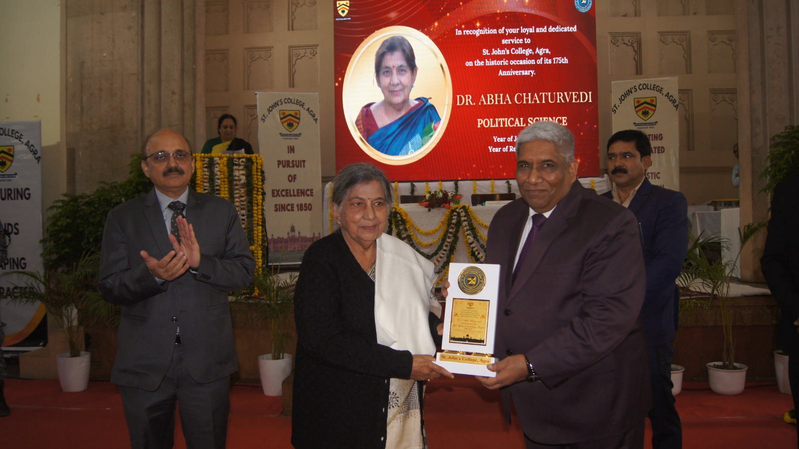 मुख्य अतिथि ने देश दुनिया में कॉलेज का नाम रोशन करने वाले पूर्व छात्रों को सम्मानित किया जिनमें प्रोफेसर फिजिशियन दयाकिशोर हाजरा, व्यवसायी ओम सेठ, सिंघल इंजीनियर कंपनी के मालिक अमर सिंघल, इंटेलिजेंस रॉ के ब्रिज किशोर शर्मा, वाइल्ड लाइफ फोटोग्राफर हरविजय सिंह भाइया, डॉ राकेश भाटिया प्रो. एस एन मेडिकल कॉलेज, श्री मृदुला मेहरोत्रा, ब्रिगेडियर विनोद दत्ता, पूर्व मंत्री राजा महेंद्र अरिदमन सिंह, राजीव गुप्ता आदि रहे। मुख्य अतिथि के करकमलों द्वारा बायोटेक्नोलॉजी विभाग, इंग्लिश विभाग और बॉटनी विभाग की ई–पत्रिकाएं विमोचित की गईं तथा कॉलेज का 175 वें वर्ष का लोगो विमोचित किया। समारोह के अंत में प्रो. सुजैन वर्गीस द्वारा सभी अतिथियों, शिक्षकों, कर्मचारियों एवं विद्यार्थियों का आभार व्यक्त किया गया। 175वाँ स्थापना दिवस सेंट जॉन्स कॉलेज, आगरा के गौरवशाली अतीत, सशक्त वर्तमान और उज्ज्वल भविष्य का प्रतीक बनकर स्मरणीय रहा। कार्यक्रम का सफल संचालन प्रो. विन्नी जैन द्वारा किया गया।
