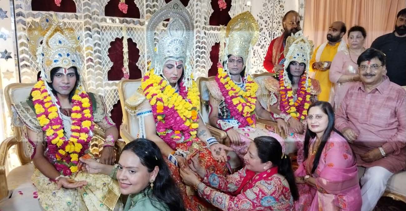 उत्तर भारत की ऐतिहासिक रामलीला महोत्सव के अंतर्गत मंगलवार को राम बारात से पूर्व, राजा दशरथ के लॉयर्स कॉलोनी स्थित अजय अग्रवाल(राजा दशरथ) के निज निवास पर श्रीराम, लक्ष्मण, भरत और शत्रुघ्न के स्वरूपों पर पारंपरिक विवाह रस्में सम्पन्न हुईं। बुधवार को ऐतिहासिक श्रीराम बारात निकलेगी लेकिन इससे पहले प्रथम चरण में राजा दशरथ की पुत्री शांता देवी के नाम से देहरी पूजन हुआ। अजय अग्रवाल (राजा दशरथ) और कल्पना अग्रवाल (रानी कौशल्या) ने आरती और तिलक के साथ चारों भाइयों का स्वागत किया। तत्पश्चात रानी कौशल्या की भूमिका निभा रहीं कल्पना अग्रवाल सहित आशिमा अग्रवाल, अनुकृति बिछोरिया, शगुन अग्रवाल, भावना अग्रवाल, आराध्या, नेहा, साक्षी, अंशिता, अलका आदि परिवार की महिलाओं ने मंगल गीत गाते हुए चारों स्वरूपों के हाथों में मेहंदी रचाई।