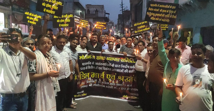 आज शाम पांच बजे ही मोतीगंज बाजार बंद हो गया। हाथों में मोमबत्ती लिए सभी व्यापारी 22 अप्रैल को कश्मीर के पहलगाम में आतंकी हमले में मृतक लोगों को श्रद्धांजली देने के लिए एकत्रित हुए। पाकिस्तान के खिलाफ खूब नारेबाजी हुई। भारत माता के जयकारों और वंदे मातरम के साथ मोतीगंज बाजार दरेसी नम्बर एक द्वार से बेलनगंज तक आतंकी हमले के विरोध में कैंडल मार्च निकाला। कैंडल मार्च में आगरा व्यापार मण्डल के पदाधिकारी भी मौजूद रहे। श्रीमोतीगंज खाद्य व्यापार समिति के अध्यक्ष महावीर मंगल ने कहा कि इस बार आतंकी और उनके आकाओं को भारत सरकार ऐसा यादगार सबक सिखाए की पीढ़िया सुधर जाए। आतंकी हमले में बेरहमी से मारे गए मृतकों के प्रति दिल में दर्द था तो आंखों में आकंती और उनके आकाओं के लिए क्रोध। महामंत्री शैलेन्द्र अग्रवाल ने कहा कि व्यापारी हर परिस्थिति सरकार के साथ है। देश को सुरक्षित रखने के लिए इस बार आतंक का जड़ से सफाया होना चाहिए।