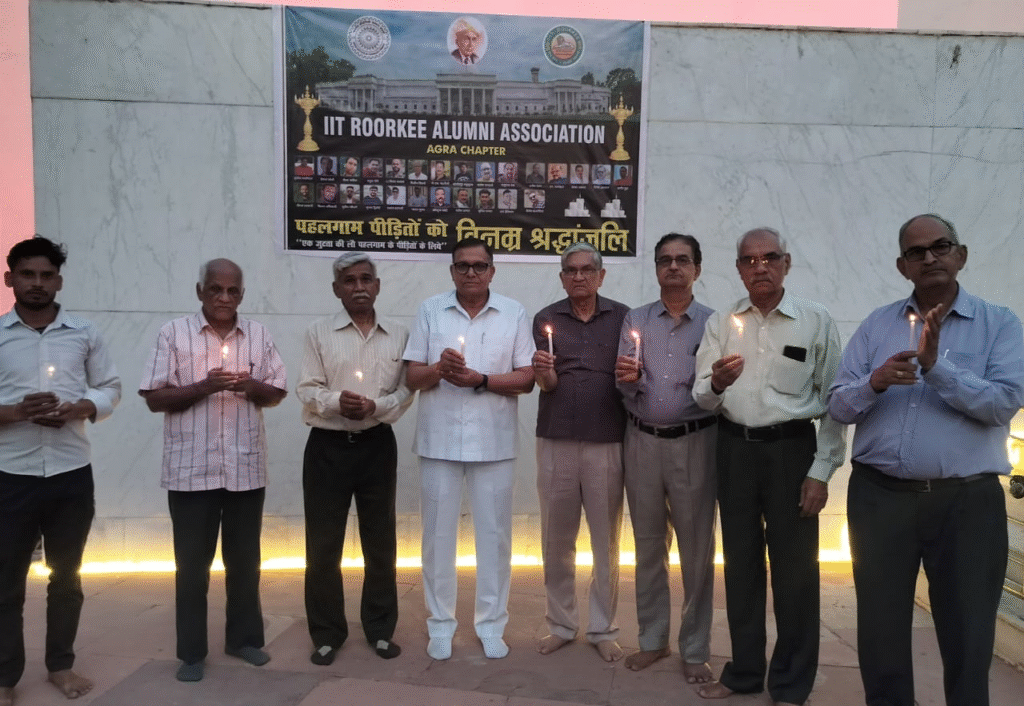 आई आई टी रुड़की एल्युमिनियम एसोसिएशन आगरा चैप्टर के सदस्यों ने अध्यक्ष ई आर के सिंह राघव एवं सचिव ई महेश चंद्र के नेतृत्व में केंडिल मार्च निकाला। शहीद स्मारक पर केंडिल जलाकर एवं मौन धारण कर आतंकी हमले में शहीद लोगों को विनम्र श्रद्धाजलि अर्पित की।पाकिस्तान मुर्दाबाद एवं हिन्दुस्तान जिंदाबाद के नारे लगाए।सभी ने इस कायराना हमले की निंदा की । पूरी दुनिया आज भारत के साथ है।भारत सरकार से पाकिस्तान को सबक सिखाने एवं आतंकवाद को जड़ से समाप्त करने की मांग की। प्रमुख रूप से ई अविनाश चंद्र, ई मोहन सिंह, ई नरेंद्र पाल सिंह,देवेंद्र थापाक,नरपाल सिंह धाकरे आदि मौजूद रहे।