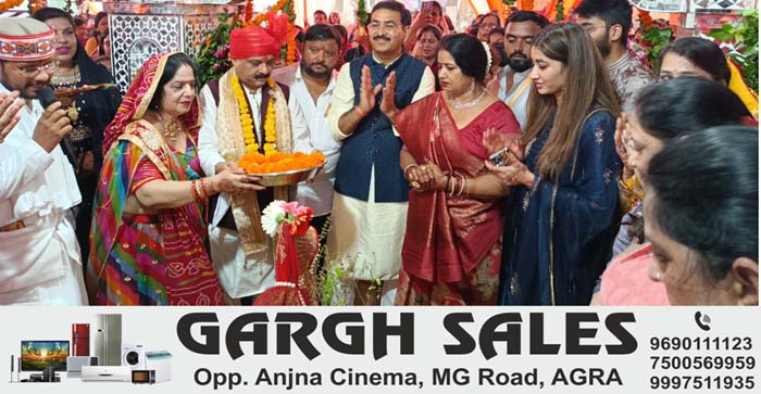 आगरा। सिर पर पगड़ी बांधे बारातियों संग राजा दशरथ, रानी कौशल्या (संतोष शर्मा, ललिता शर्मा) भी अपने परिवार संग तुलसी सालिगराम विवाह में शामिल हुए। रानी कौशल्या ने तुलसी जी के लिए सुहाग पिटारी, साड़ी लहंगा, चुनरी उपहार में दिए। इस अवसर पर प्रखर शर्मा, युक्ति शर्मा भी मौजूद थीं।