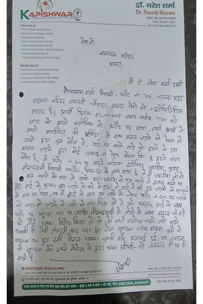 आगरा के न्यूरोफिजीशियन डॉ. नरेश शर्मा शांति मधुवन प्लाजा और सुल्तानगंज की पुलिया सर्विस रोड पर प्रैक्टिस करते हैं। वहीं, खदारी स्थित नालंदा प्राइड में रहते हैं। 27 अप्रैल को संजय प्लेस में फर्नीचर के कारोबारी जगदीश कुमार मीर चंदानी ने नालंदा प्राइड सोसाइटी में रहने वाले विशाल मेहरा के घर पर काम करने के लिए अपने कर्मचारी बारहखंभा निवासी वसीम और जतिन को भेजा।