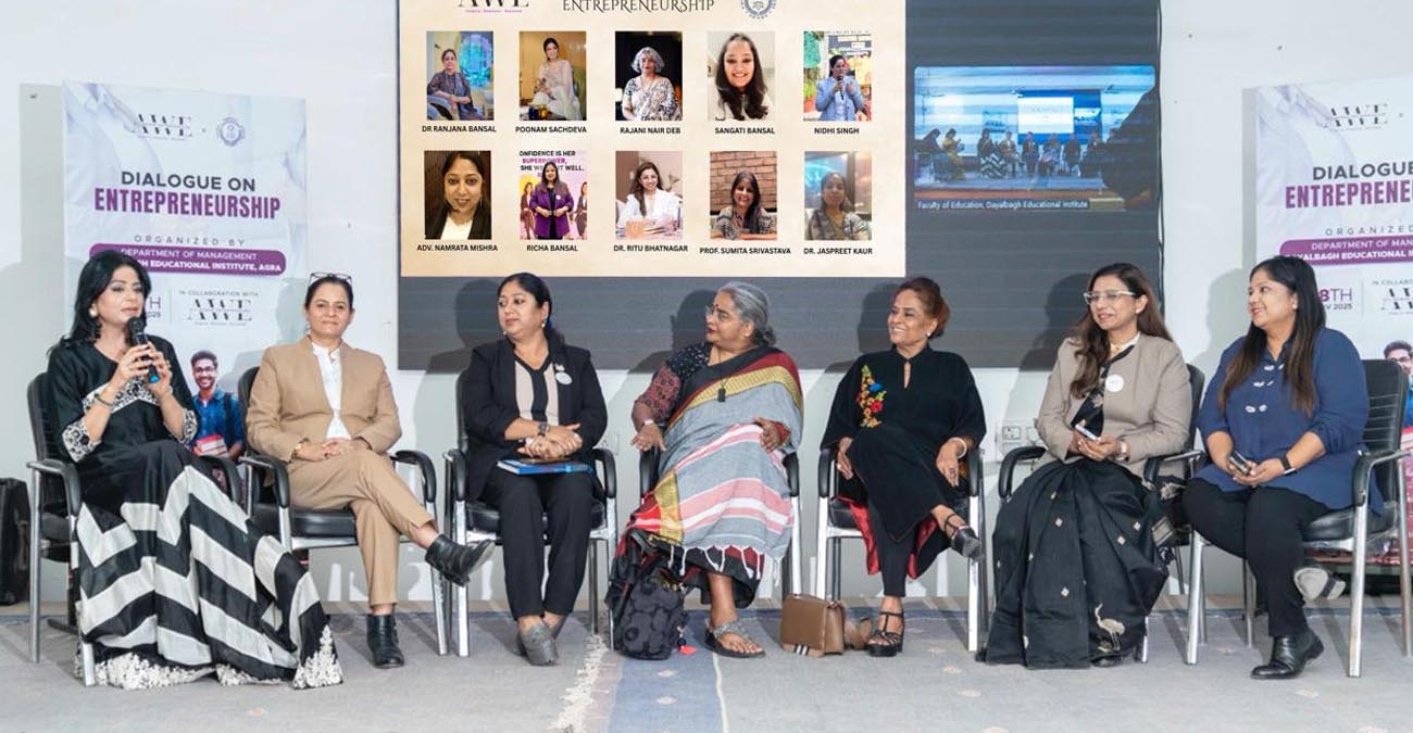 आगरा में दयालबाग शैक्षिक संस्थान (DEI) के प्रबंधन विभाग में मंगलवार को ऑल वूमेन एंटरप्रेन्योर्स AWE के सहयोग से डायलॉग ऑन एंटरप्रेन्योरशिप का आयोजन किया गया. स्टूडेंट्स ने अपनी नवाचारी सोच को पूरी तरह से अभिव्यक्त किया तो वहीं AWE के प्रतिष्ठित जज पैनल ने भविष्य के इन युवा उद्यमियों को प्रेरित किया. उन्हें बिजनेस आइडियाज दिए और आत्मविश्वास तथा उद्देश्य के साथ उद्यमिता की दिशा में आगे बढ़ने के लिए प्रोत्साहित किया.