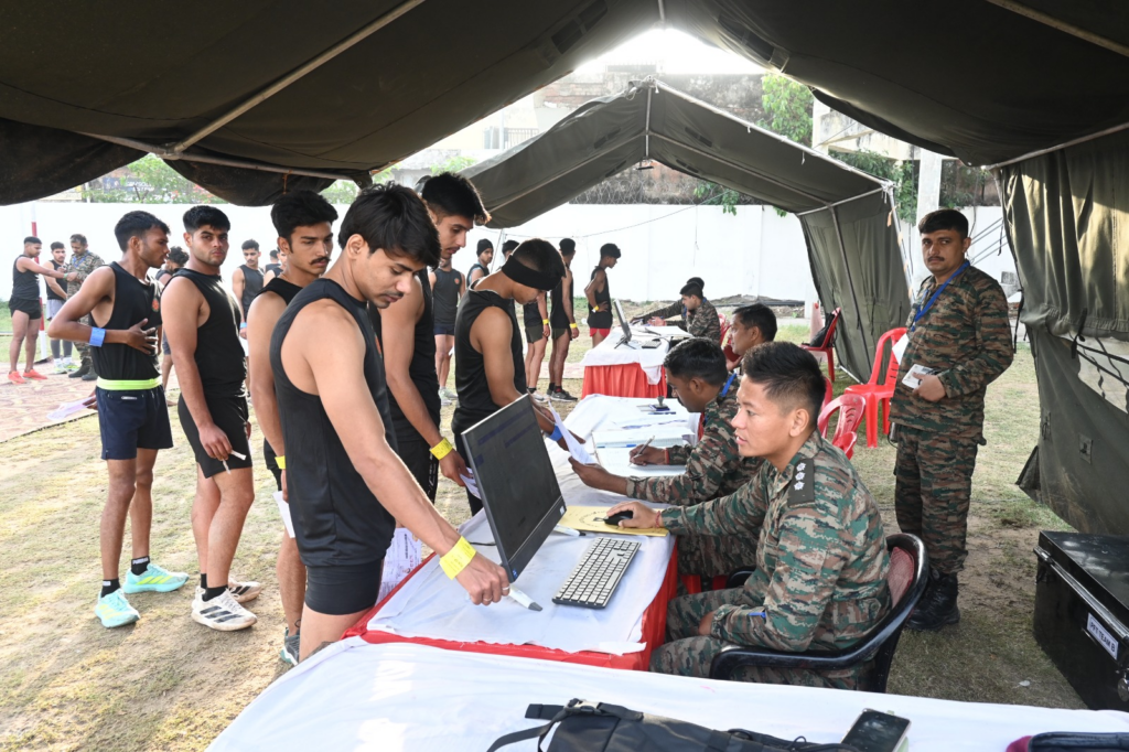 आगरा में आयोजित अग्निवीर भर्ती रैली प्रतिकूल मौसम परिस्थितियों, जिनमें भारी वर्षा, तेज़ हवाएँ तथा अचानक आए तूफ़ान शामिल हैं, के बावजूद सुचारू, व्यवस्थित एवं अनुशासित ढंग से संपन्न हुई। अभ्यर्थियों एवं आयोजन दल दोनों के धैर्य एवं दृढ़ संकल्प के कारण सभी गतिविधियाँ निर्धारित कार्यक्रम के अनुसार बिना किसी व्यवधान के संचालित की गईं। आज के लिए बुलाए गए झांसी एवं ललितपुर जनपदों के जनरल ड्यूटी (GD) वर्ग तथा आगरा जनपद के क्लर्क/स्टोर कीपर टेक्निकल (SKT) वर्ग के अभ्यर्थियों ने पिछली रात के चुनौतीपूर्ण मौसम के बावजूद उच्च उत्साह एवं अनुशासन के साथ रैली स्थल पर उपस्थिति दर्ज कराई। लगभग 1100 अभ्यर्थियों में से करीब 850 अभ्यर्थियों की उपस्थिति दर्ज की गई, जो विपरीत परिस्थितियों में भी मजबूत भागीदारी को दर्शाती है।