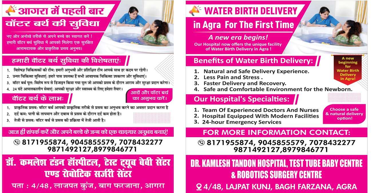 आगरालीक्स…आगरा में पहली बार वॉटर बर्थ की सुविधा. शहर के डॉ. कमलेश टंडन हॉस्पीटल, टेस्ट ट्यूब बेबी सेंटर एण्ड रोबोटिक सर्जरी सेंटर में सुरक्षित आरामदायक और प्राकृतिक प्रसव सुविधा