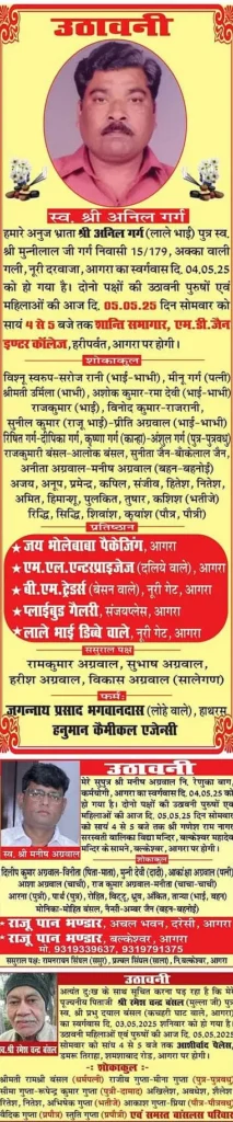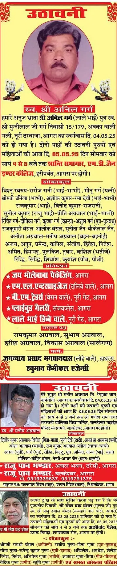 Agra Sad News: Obituaries Agra on 5th May 2025