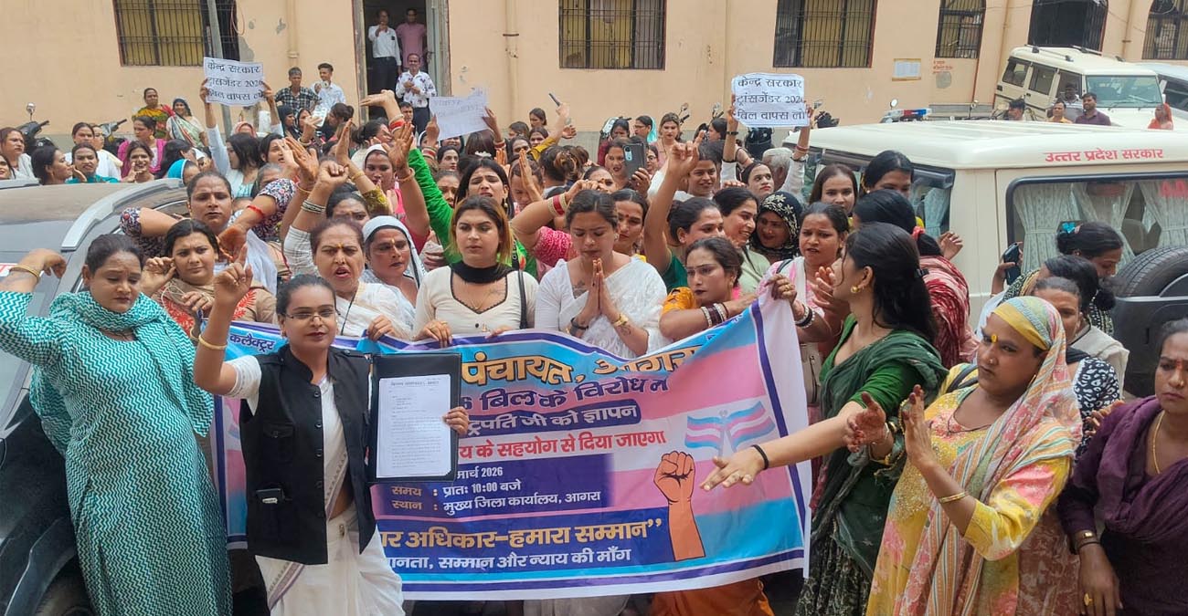 “ट्रांसबिल 2026” के विरोध में ट्रांसजेंडर (किन्नर) समुदाय ने सोमवार को आगरा में जोरदार तरीके से अपनी आवाज उठाई और राष्ट्रपति को संबोधित ज्ञापन जिलाधिकारी के माध्यम से सौंपा। इस दौरान समुदाय के लोगों ने एकजुट होकर अपने संवैधानिक अधिकारों की रक्षा की मांग की और चेतावनी दी कि यदि उनकी मांगों पर ध्यान नहीं दिया गया तो आंदोलन और तेज किया जाएगा।ज्ञापन में स्पष्ट रूप से कहा गया कि प्रस्तावित विधेयक ट्रांसजेंडर समुदाय के मौलिक अधिकारों पर प्रतिकूल प्रभाव डाल सकता है। समुदाय ने NALSA बनाम भारत संघ (2014) के ऐतिहासिक निर्णय का हवाला देते हुए कहा कि सर्वोच्च न्यायालय ने ट्रांसजेंडर व्यक्तियों को “तीसरे लिंग” के रूप में मान्यता देते हुए उनकी आत्म-पहचान को मौलिक अधिकार माना है।