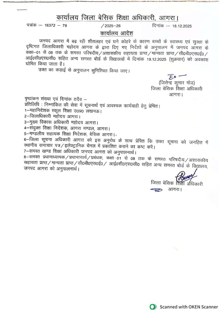 आगरालीक्स…आगरा में कड़ाके की ठंड को लेकर स्कूलों के लिए नये आदेश जारी…