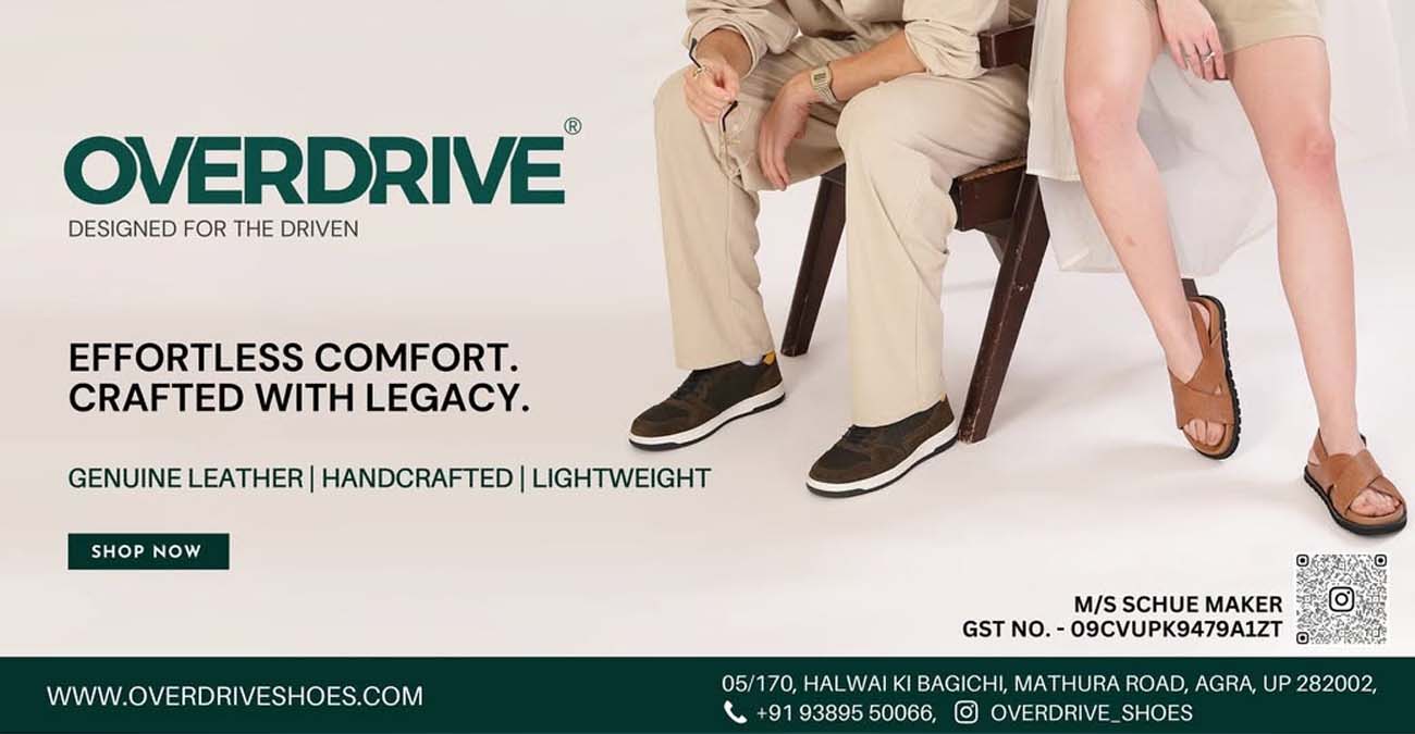 “क्लासी, सौम्य, परिष्कृत और आरामदायक। जूते में आगरा का अपना ब्रांड Overdrive Shoes. अपने ग्राहकों को बेहद किफ़ायती दामों पर स्टाइल का बेहतरीन अनुभव प्रदान करने का इच्छुक है। बेहतरीन क्वालिटी के लेदर से बने ये सावधानीपूर्वक डिज़ाइन किए गए जूते निश्चित रूप से आपके पहनावे की शोभा बढ़ाएँगे।