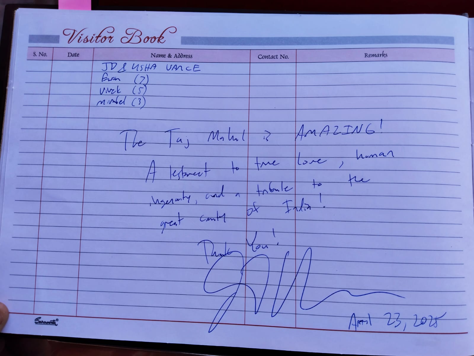 अमेरिकी उप राष्ट्रपति जेडी वेंस ने पत्नी और बच्चों के साथ ताजमहल देखने के बाद विजिटर बुक में लिखा अमेजिंग,