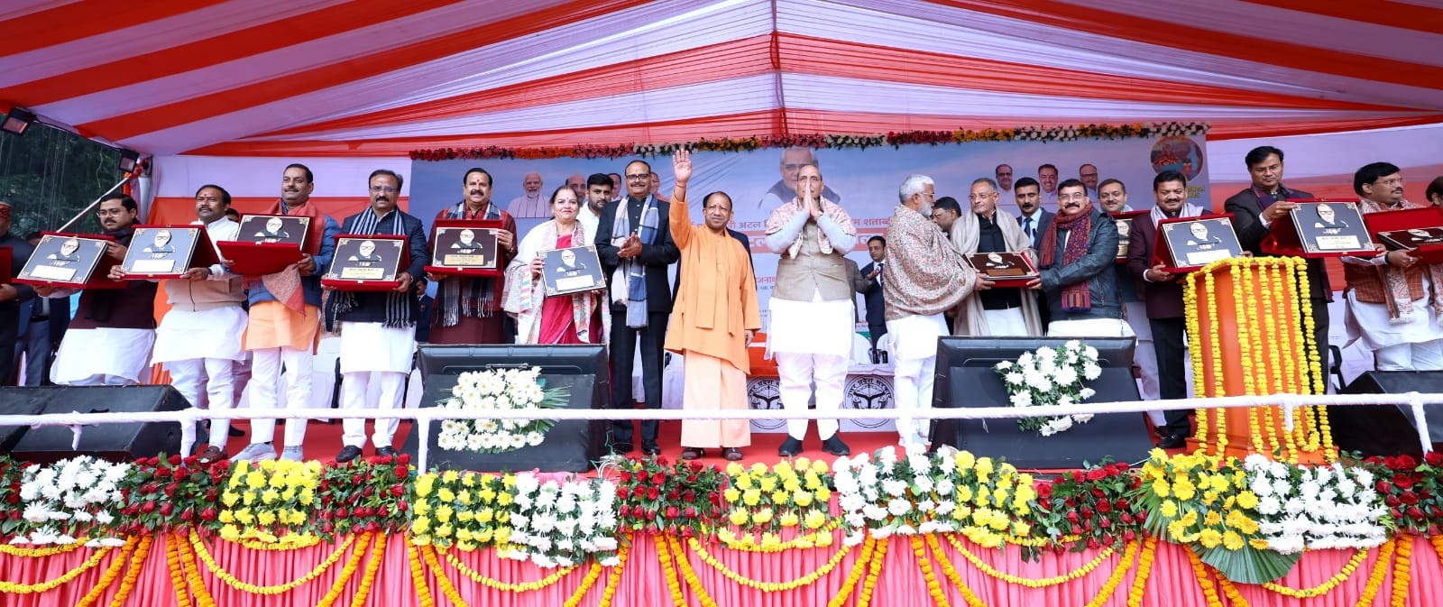 पूर्व प्रधानमंत्री अटल विहारी वाजपेयी की जन्मशती पर अटल युवा महाकुंभ कार्यक्रम में रक्षा मंत्री राजनाथ सिंह और मुख्यमंत्री योगी आदित्यनाथ को अटल जी की प्रतिमा भेंट की गई। साथ ही अटल जी की पुस्तक भी भेंट की गई।