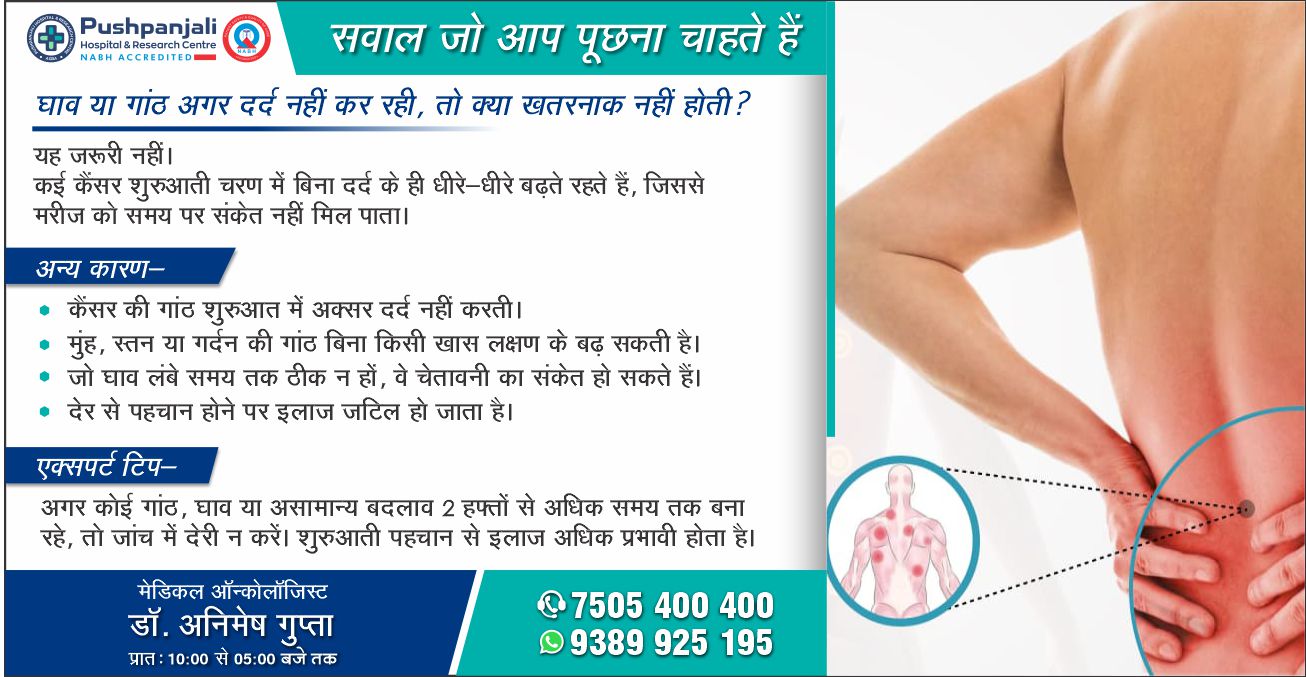 आगरालीक्स…शरीर में घाव या गांठ दर्द नहीं कर रही है तो भी जांच जरूरी. कैंसर का हो सकता है शुरुआती चरण. आगरा के पुष्पांजलि हॉस्पिटल में डॉ. अनिमेष गुप्ता से लें परामर्श. संपर्क करें 7505400400, 9389925195