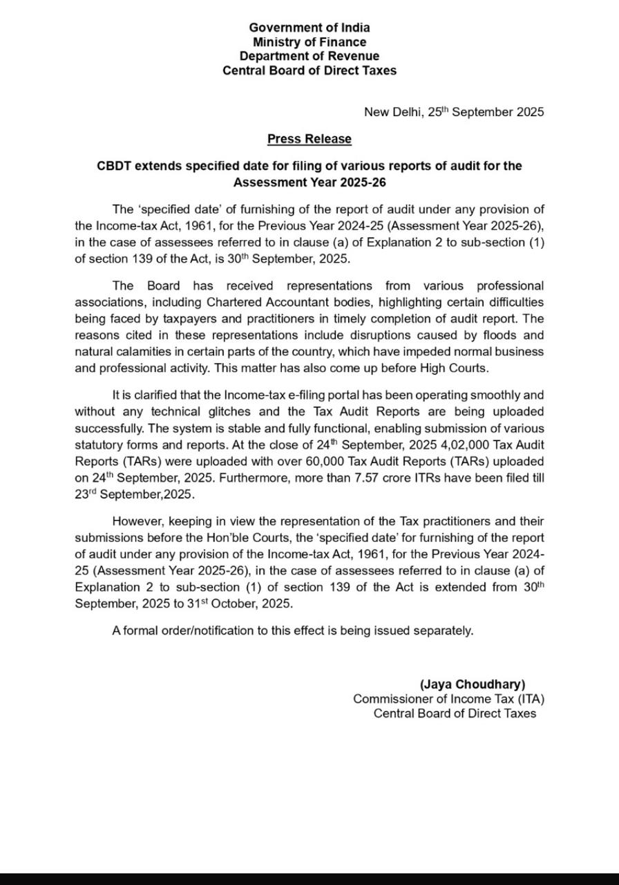 इनकम टैक्स भरने वालों के लिए विभाग की ओर से बढ़ी खबर आई है. केंद्रीय प्रत्यक्ष कर बोर्ड यानी सीबीडीटी ने आडिट रिपोर्ट दाखिल करने की अंतिम तिथि को बढ़ा दिया है. पहले सीबीडीटी को दाखिल करने की अंतिम तिथि 30 सितंबर 2025 थी लेकिन अब एक महीने यानी 31 अक्टूबर 2025 तक इसे बढ़ा दिया गया है. यह फैसला कर दाताओं को राहत देगा और उनहें आडिट रिपोर्ट तैयार करने के लिए अधिक समय मिलेगा.